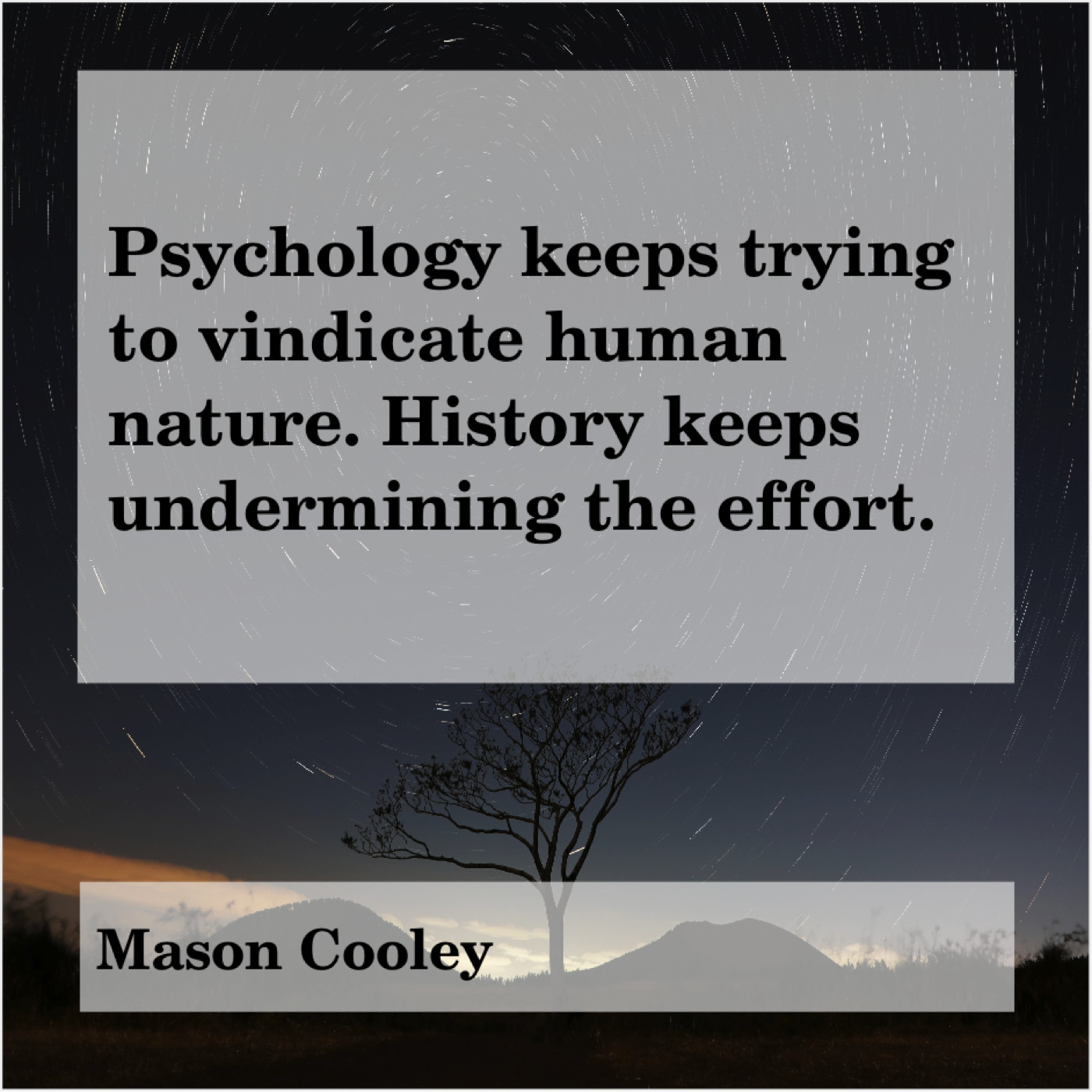 Mason Cooley Mason Cooley – Psychology keeps trying to vindicate… February 14, 2019 admin “Psychology keeps trying to vindicate human nature. History keeps undermining the effort.”-Mason Cooley