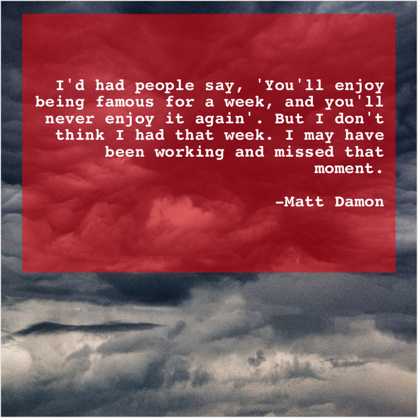 Matt Damon Matt Damon – I’d had people say, ‘You’ll… March 6, 2019 admin “I’d had people say, ‘You’ll enjoy being famous for a week, and you’ll never enjoy it again’. But I don’t think I had that week. I may have been working and missed that moment.”-Matt Damon