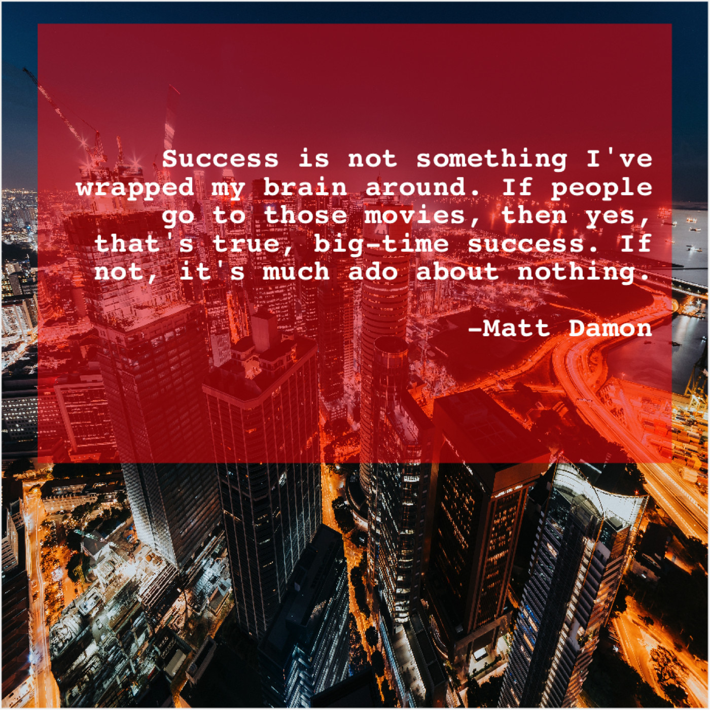 Matt Damon Matt Damon – Success is not something I’ve… February 27, 2019 admin “Success is not something I’ve wrapped my brain around. If people go to those movies, then yes, that’s true, big-time success. If not, it’s much ado about nothing.”-Matt Damon