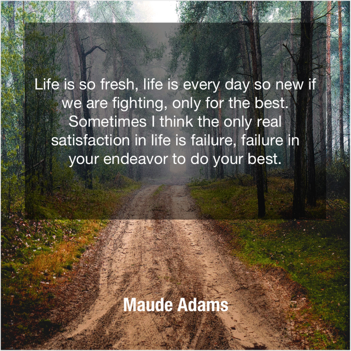 Maude Adams Maude Adams – Life is so fresh, life… October 4, 2019 admin “Life is so fresh, life is every day so new if we are fighting, only for the best. Sometimes I think the only real satisfaction in life is failure, failure in your endeavor to do your best.”-Maude Adams