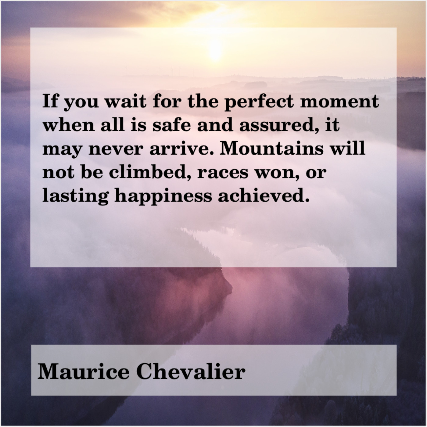 Maurice Chevalier Maurice Chevalier – If you wait for the… April 18, 2019 admin “If you wait for the perfect moment when all is safe and assured, it may never arrive. Mountains will not be climbed, races won, or lasting happiness achieved.”-Maurice Chevalier