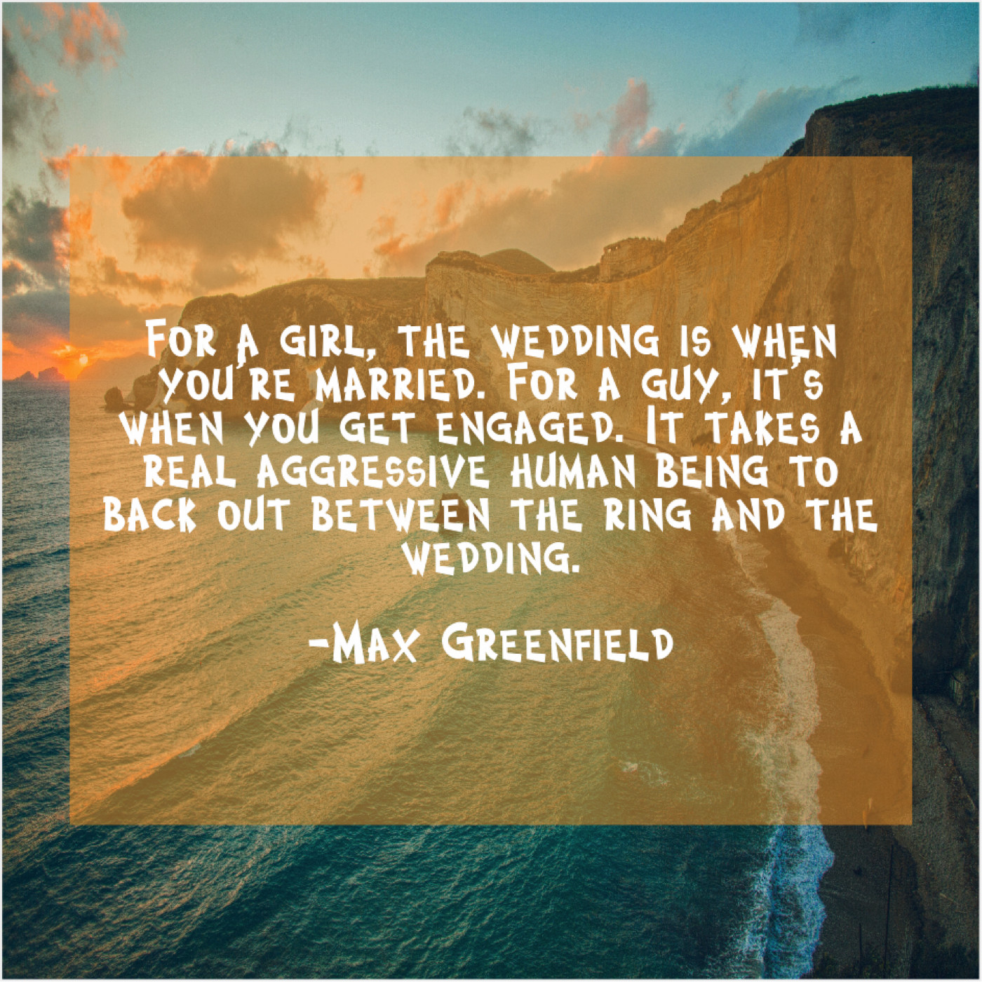 Max Greenfield Max Greenfield – For a girl, the wedding… January 26, 2019 admin “For a girl, the wedding is when you’re married. For a guy, it’s when you get engaged. It takes a real aggressive human being to back out between the ring and the wedding.”-Max Greenfield