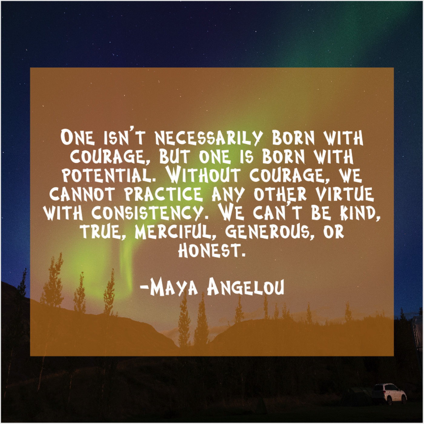 Maya Angelou Maya Angelou – One isn’t necessarily born with… June 14, 2019 admin “One isn’t necessarily born with courage, but one is born with potential. Without courage, we cannot practice any other virtue with consistency. We can’t be kind, true, merciful, generous, or honest.”-Maya Angelou