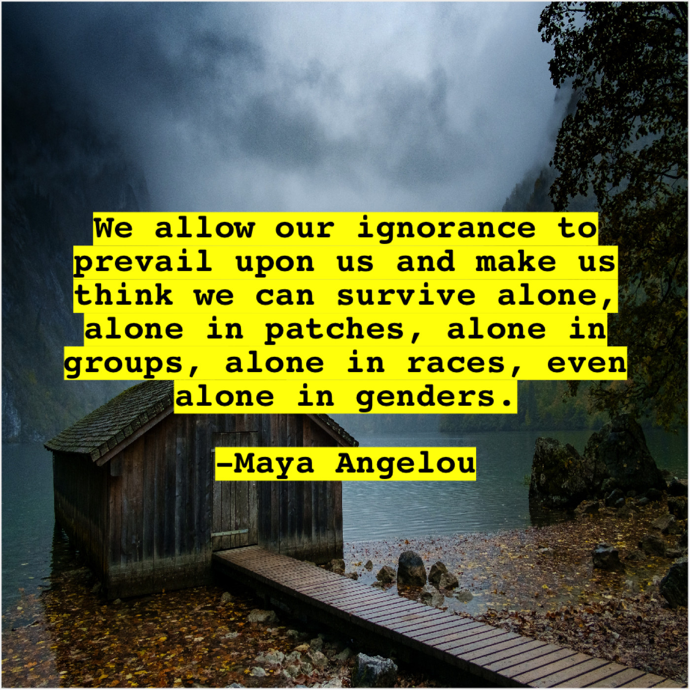 Maya Angelou Maya Angelou – We allow our ignorance to… September 24, 2019 admin “We allow our ignorance to prevail upon us and make us think we can survive alone, alone in patches, alone in groups, alone in races, even alone in genders.”-Maya Angelou