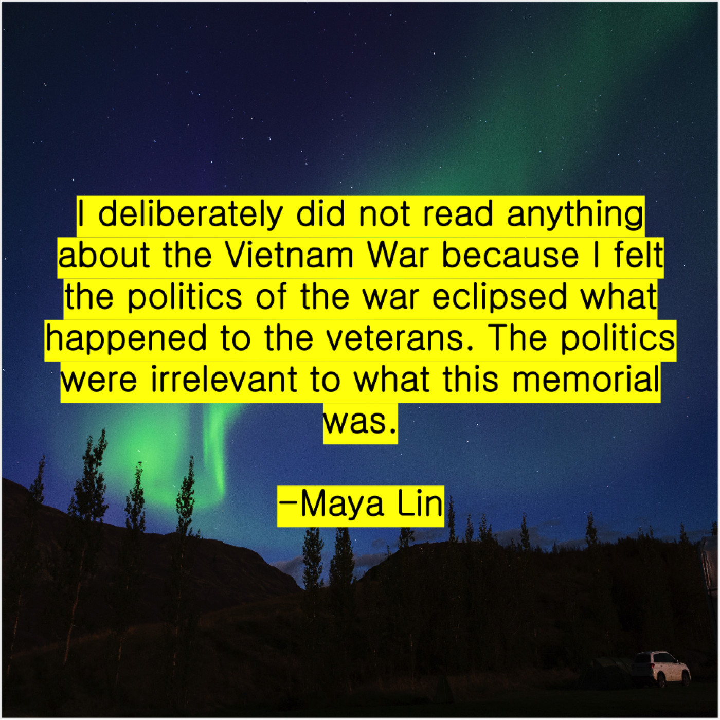 “I deliberately did not read anything about the Vietnam War because I felt the politics of the war eclipsed what happened to the veterans. The politics were irrelevant to what this memorial was.”