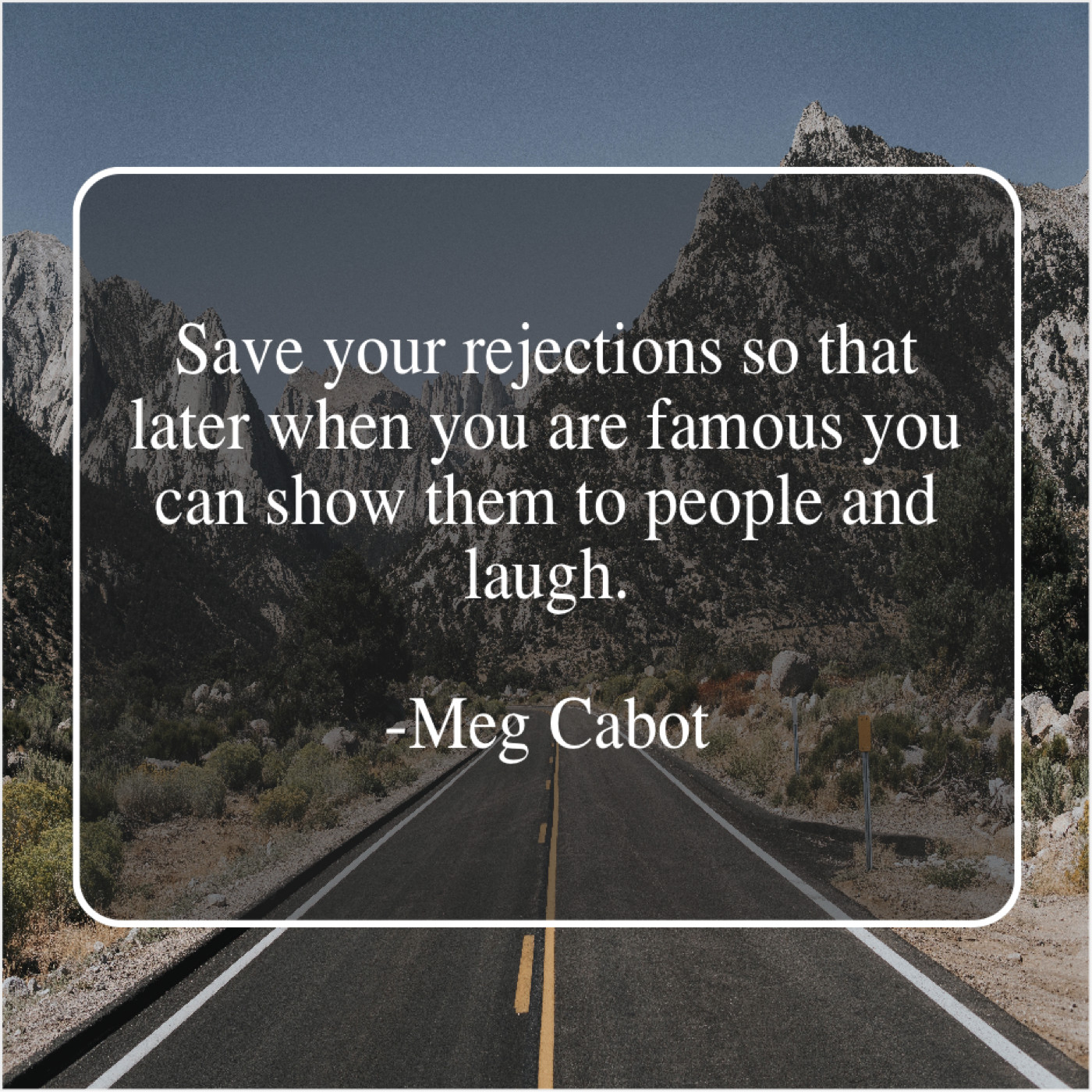 Meg Cabot Meg Cabot – Save your rejections so that… March 19, 2019 admin “Save your rejections so that later when you are famous you can show them to people and laugh.”-Meg Cabot