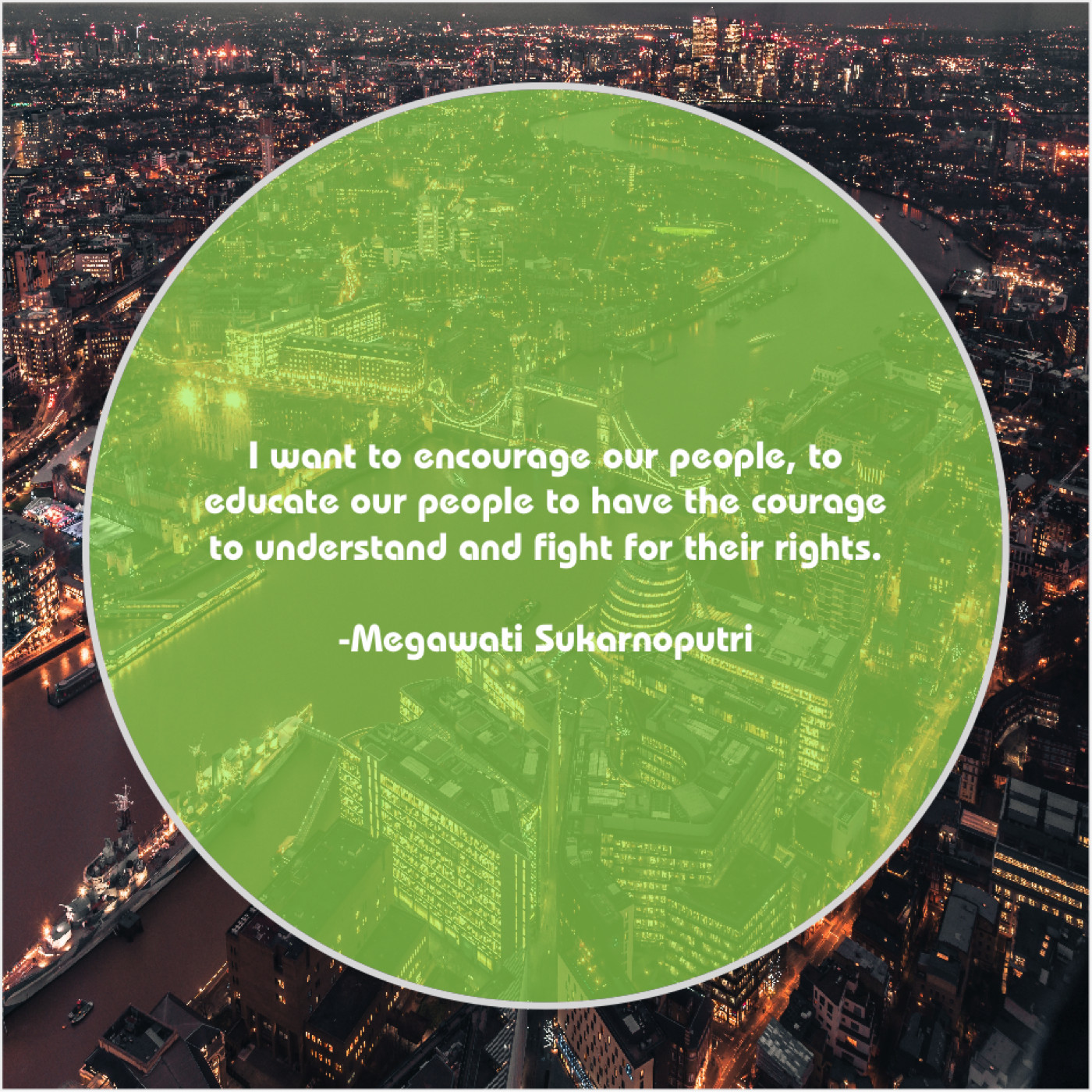 Megawati Sukarnoputri Megawati Sukarnoputri – I want to encourage our… June 30, 2019 admin “I want to encourage our people, to educate our people to have the courage to understand and fight for their rights.”-Megawati Sukarnoputri