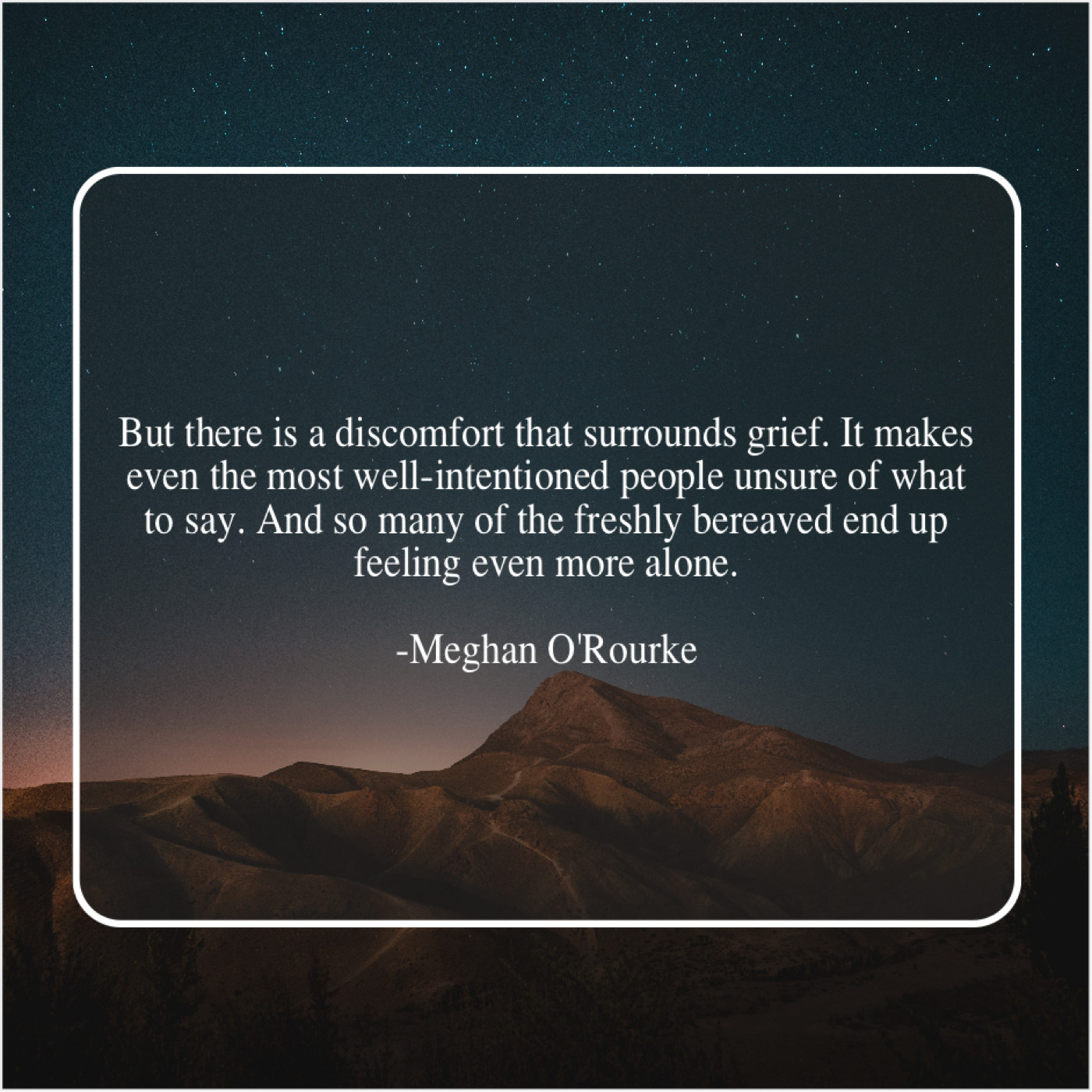 Meghan O'Rourke Meghan O’Rourke – But there is a discomfort… February 21, 2019 admin “But there is a discomfort that surrounds grief. It makes even the most well-intentioned people unsure of what to say. And so many of the freshly bereaved end up feeling even more alone.”-Meghan O’Rourke