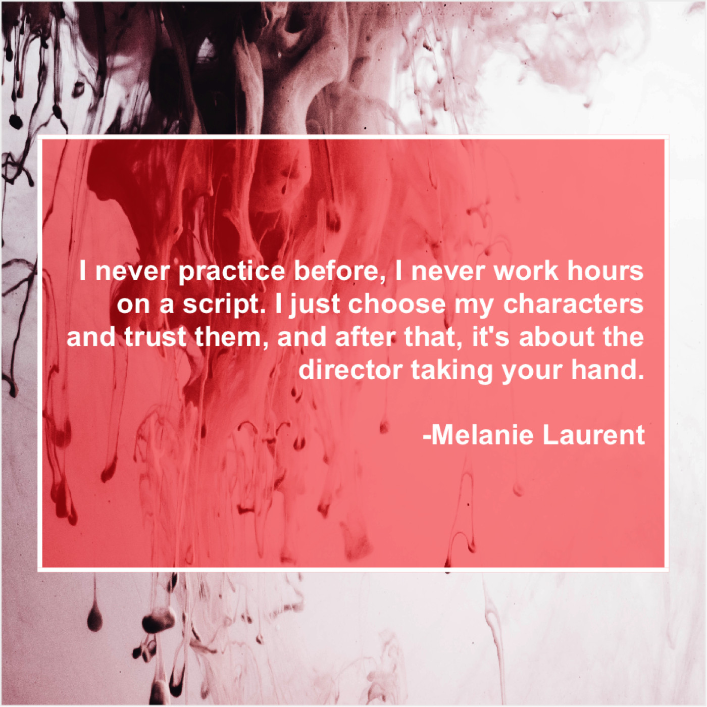 Melanie Laurent Melanie Laurent – I never practice before, I… April 14, 2019 admin “I never practice before, I never work hours on a script. I just choose my characters and trust them, and after that, it’s about the director taking your hand.”-Melanie Laurent