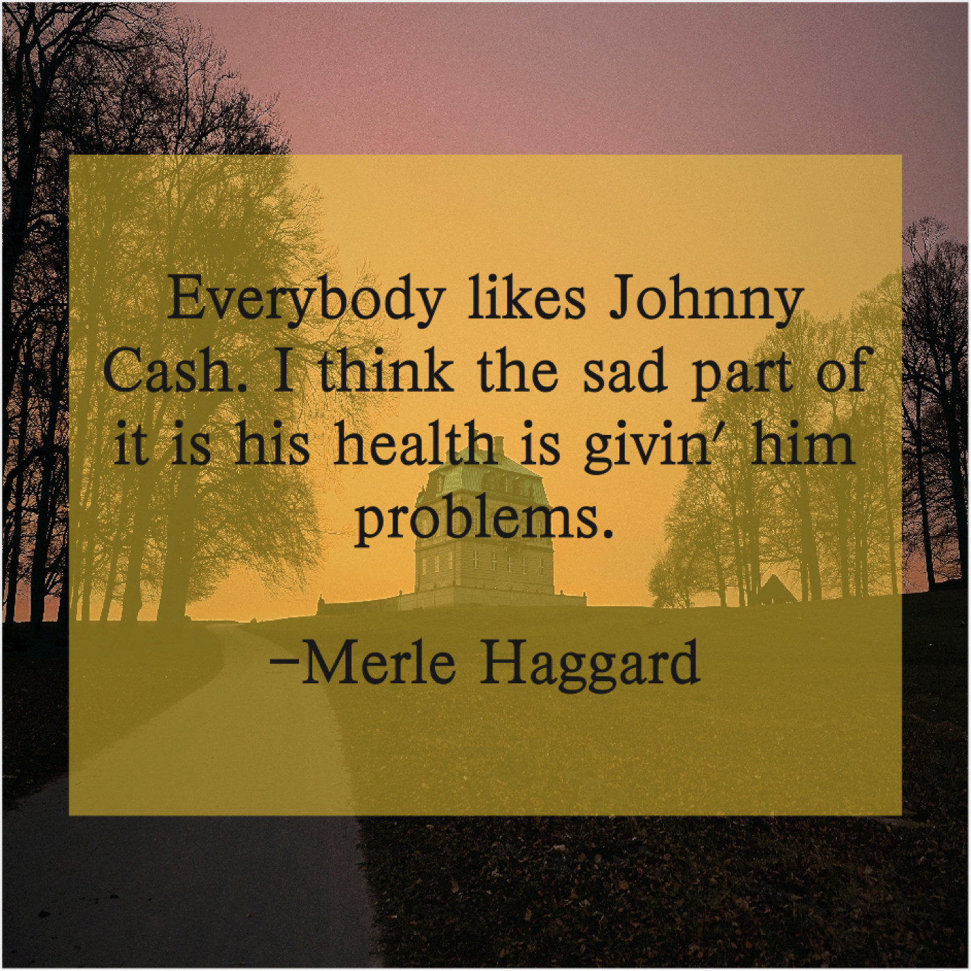 Merle Haggard Merle Haggard – Everybody likes Johnny Cash. I… September 24, 2019 admin “Everybody likes Johnny Cash. I think the sad part of it is his health is givin’ him problems.”-Merle Haggard