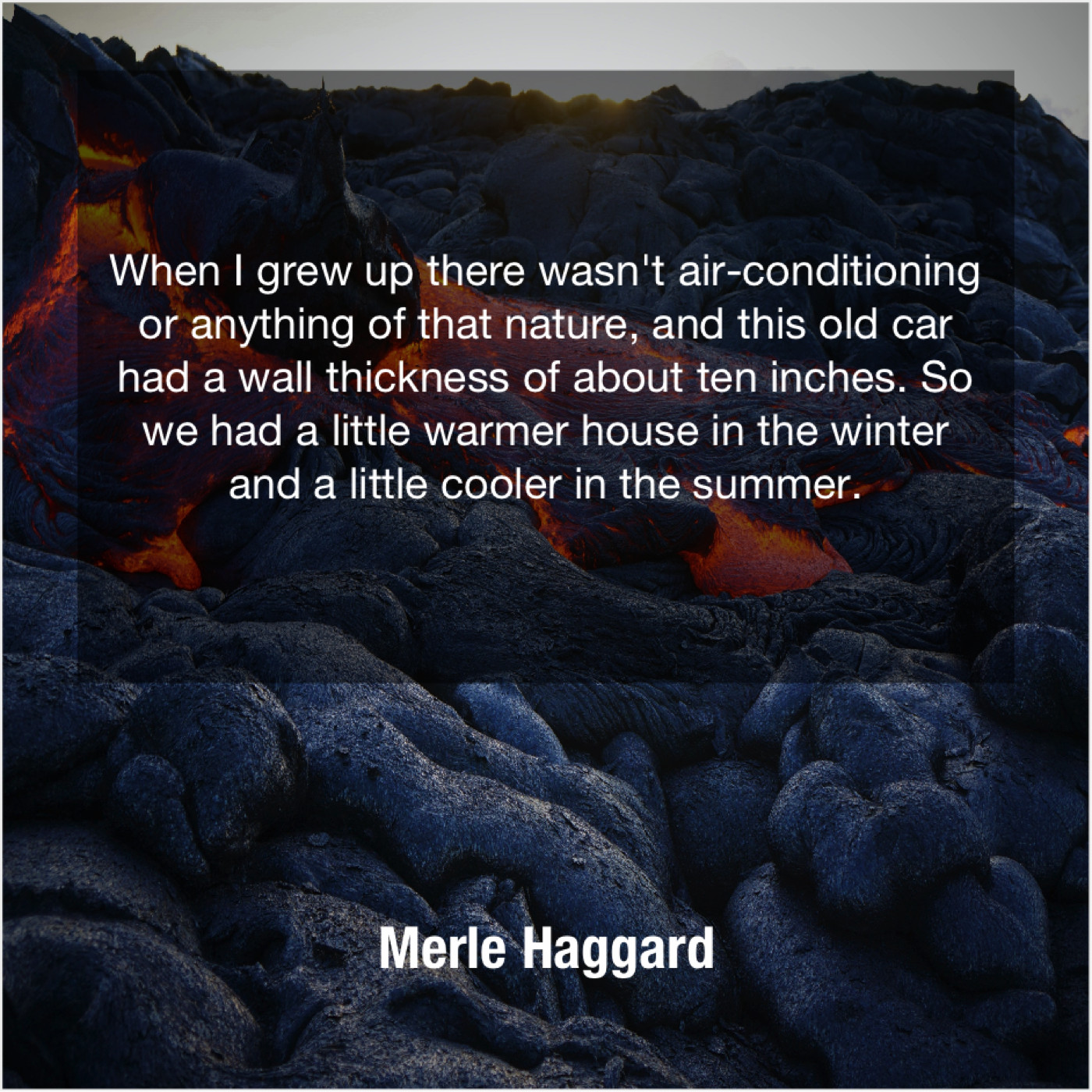 Merle Haggard Merle Haggard – When I grew up there… May 18, 2019 admin “When I grew up there wasn’t air-conditioning or anything of that nature, and this old car had a wall thickness of about ten inches. So we had a little warmer house in the winter and a little cooler in the summer.”-Merle Haggard