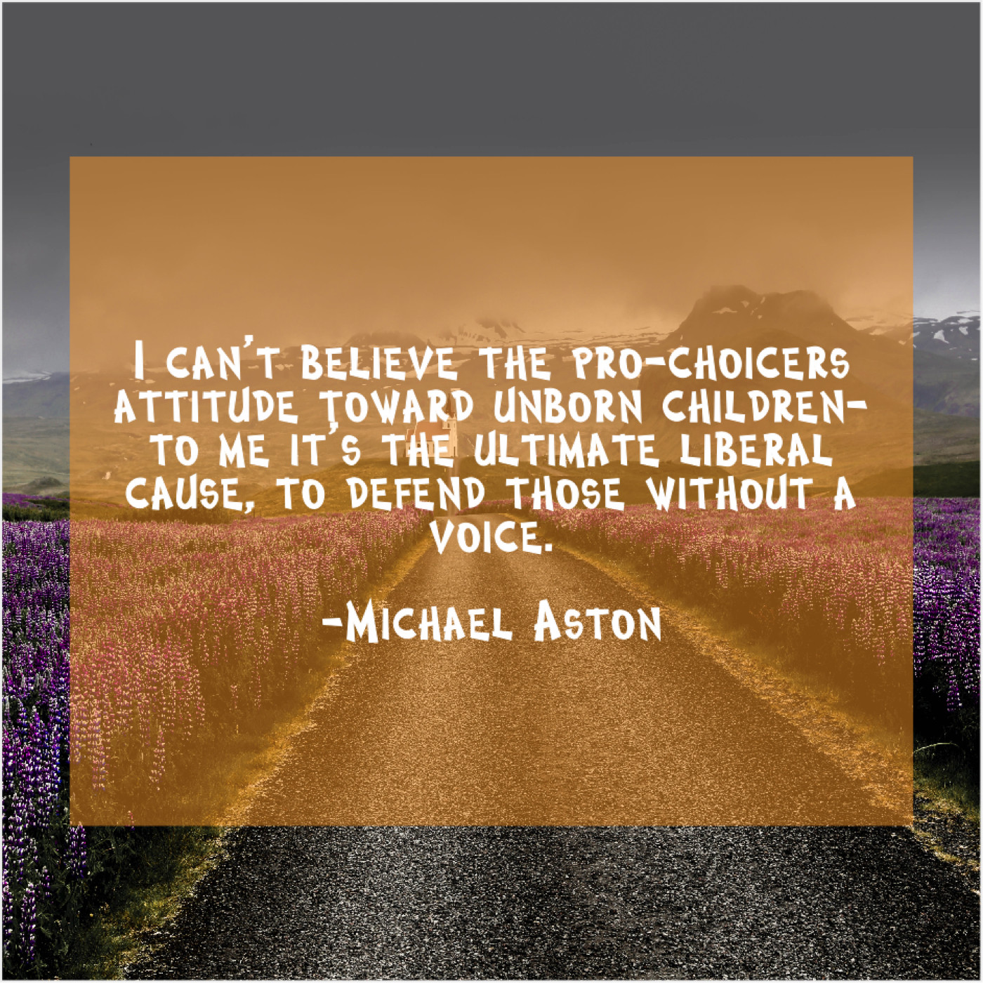 Michael Aston Michael Aston – I can’t believe the pro… April 19, 2019 admin “I can’t believe the pro-choicers attitude toward unborn children-to me it’s the ultimate liberal cause, to defend those without a voice.”-Michael Aston