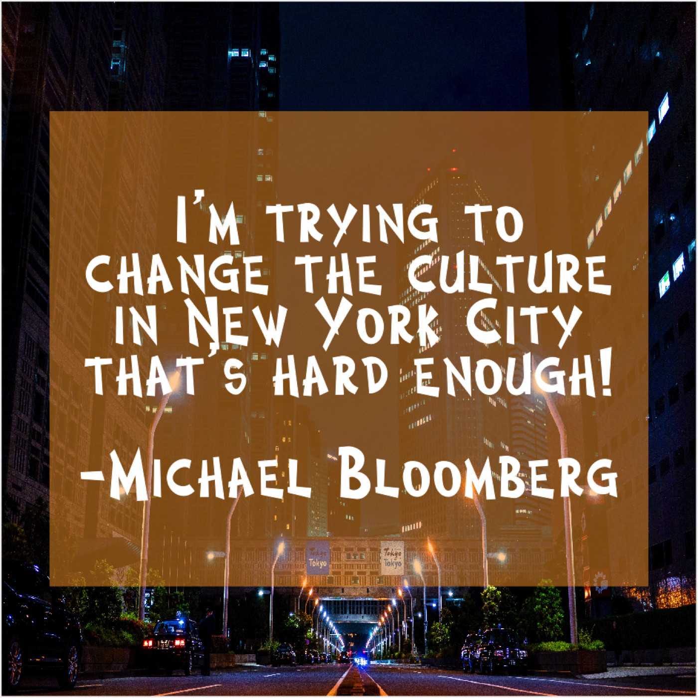 Michael Bloomberg Michael Bloomberg – I’m trying to change the… May 6, 2019 admin “I’m trying to change the culture in New York City that’s hard enough!”-Michael Bloomberg
