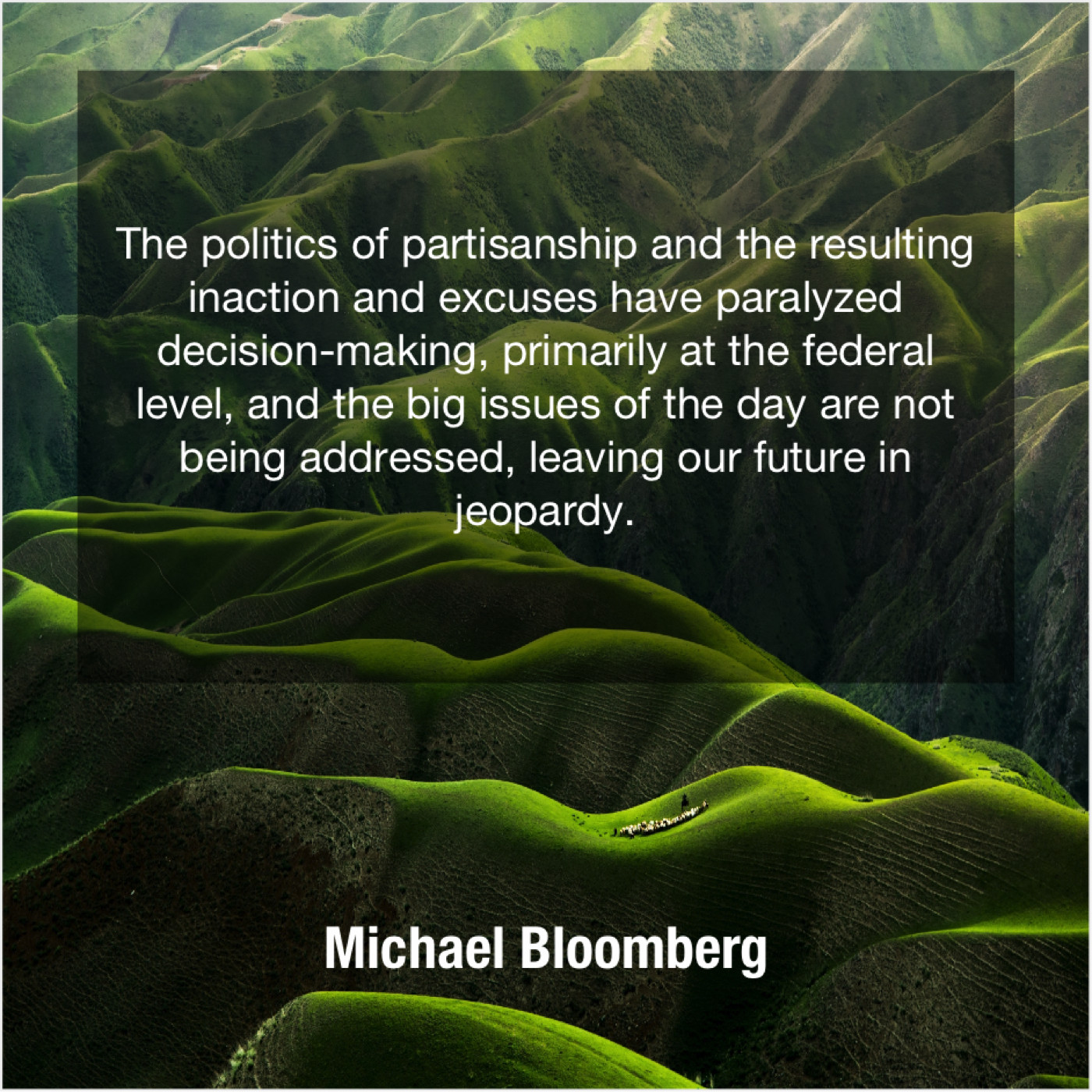 “The politics of partisanship and the resulting inaction and excuses have paralyzed decision-making, primarily at the federal level, and the big issues of the day are not being addressed, leaving our future in jeopardy.”