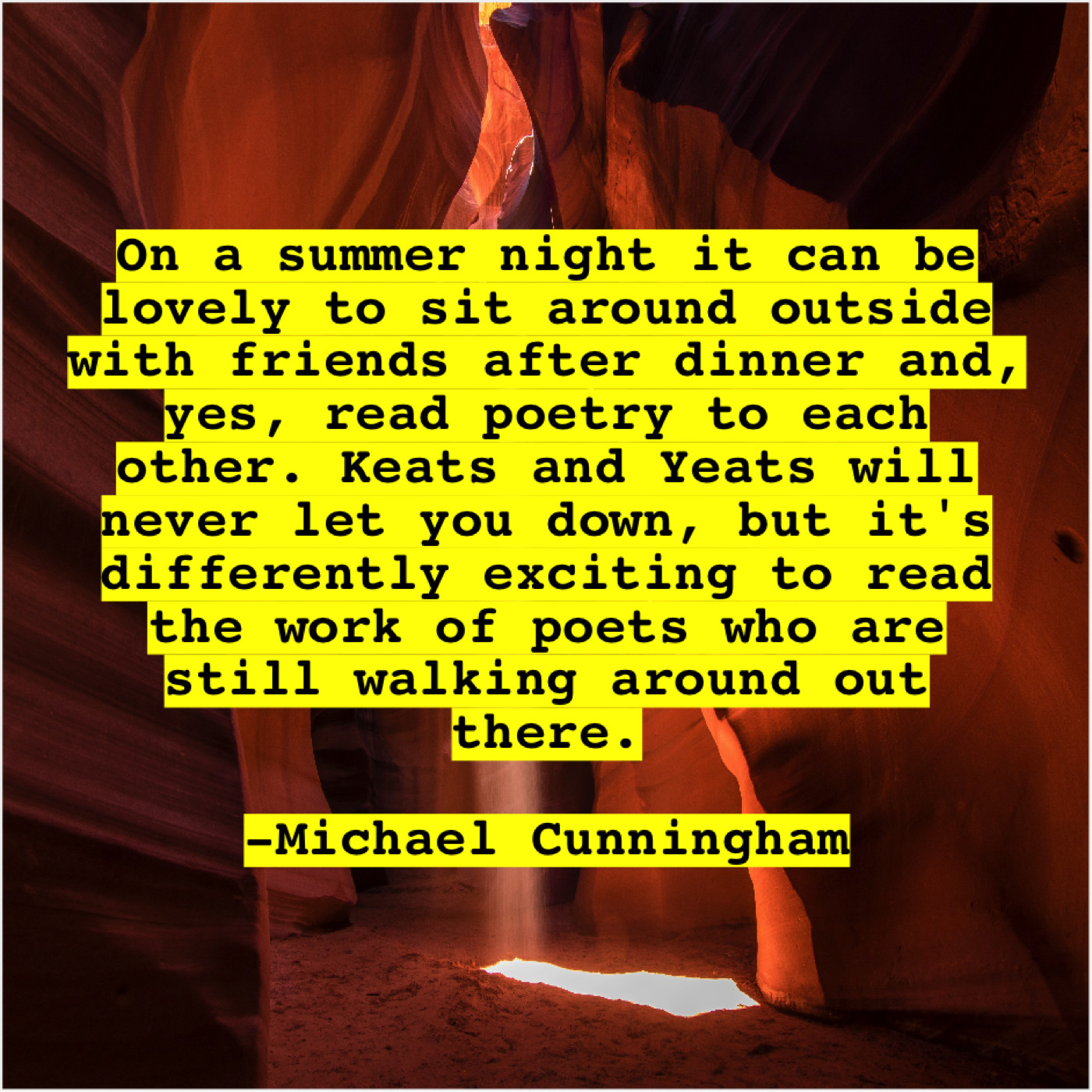 “On a summer night it can be lovely to sit around outside with friends after dinner and, yes, read poetry to each other. Keats and Yeats will never let you down, but it’s differently exciting to read the work of poets who are still walking around out there.”
