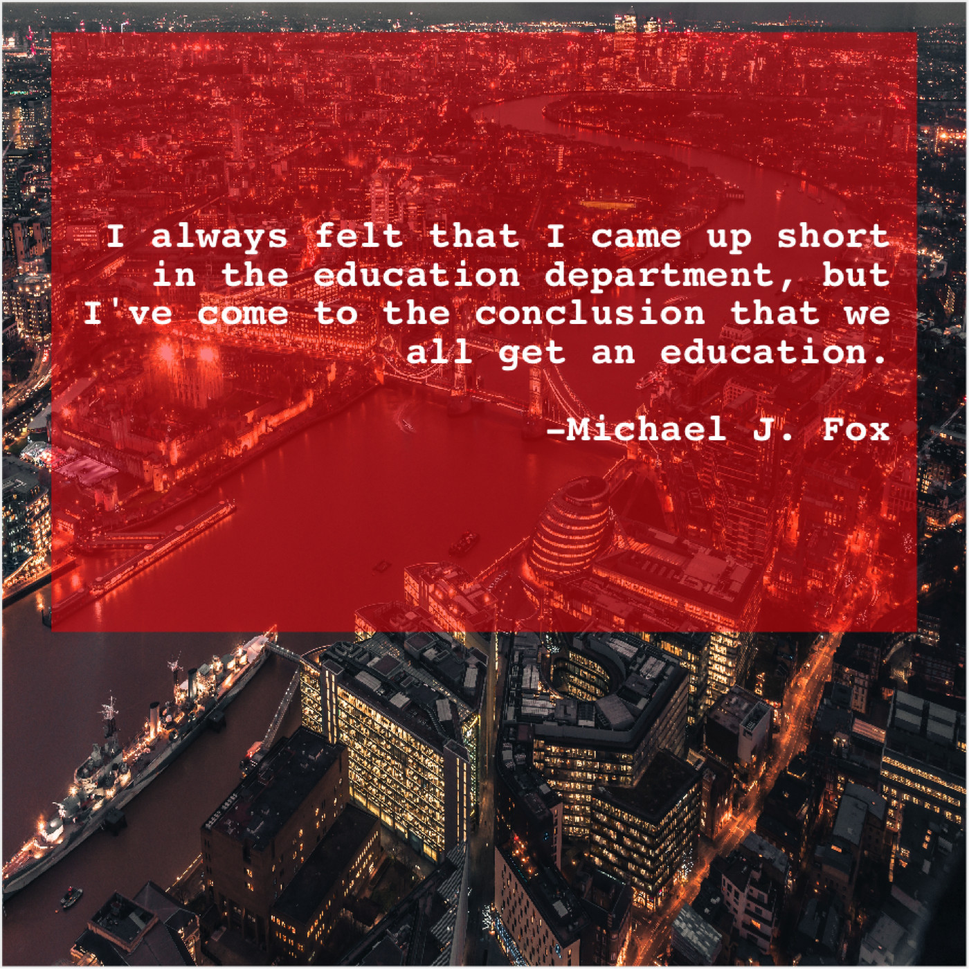 Michael J. Fox Michael J. Fox – I always felt that I… May 5, 2019 admin “I always felt that I came up short in the education department, but I’ve come to the conclusion that we all get an education.”-Michael J. Fox