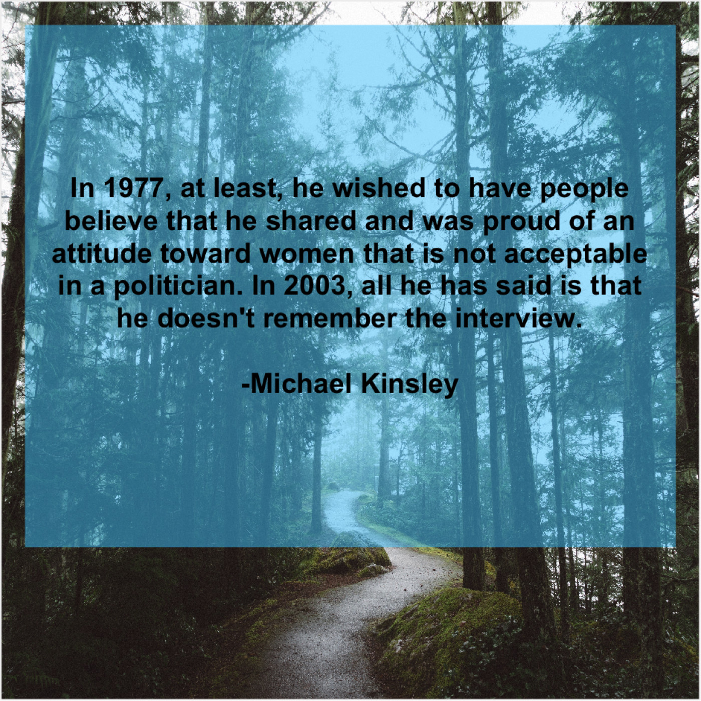 Michael Kinsley Michael Kinsley – In 1977, at least, he… December 7, 2018 admin “In 1977, at least, he wished to have people believe that he shared and was proud of an attitude toward women that is not acceptable in a politician. In 2003, all he has said is that he doesn’t remember the interview.”-Michael Kinsley