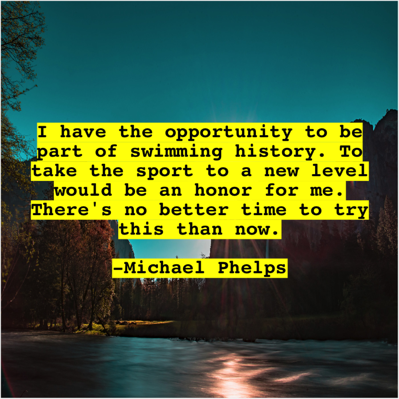 Michael Phelps Michael Phelps – I have the opportunity to… November 25, 2018 admin “I have the opportunity to be part of swimming history. To take the sport to a new level would be an honor for me. There’s no better time to try this than now.”-Michael Phelps