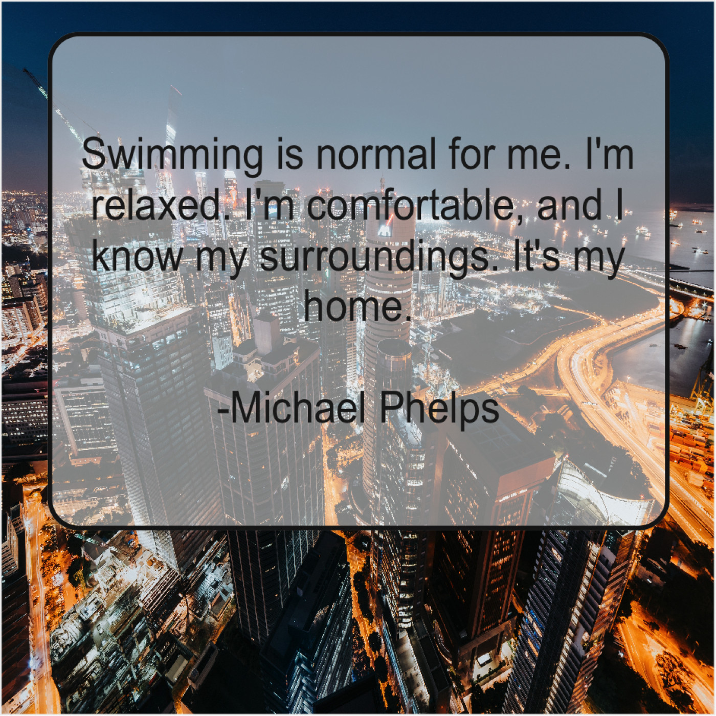 Michael Phelps Michael Phelps – Swimming is normal for me… August 18, 2019 admin “Swimming is normal for me. I’m relaxed. I’m comfortable, and I know my surroundings. It’s my home.”-Michael Phelps