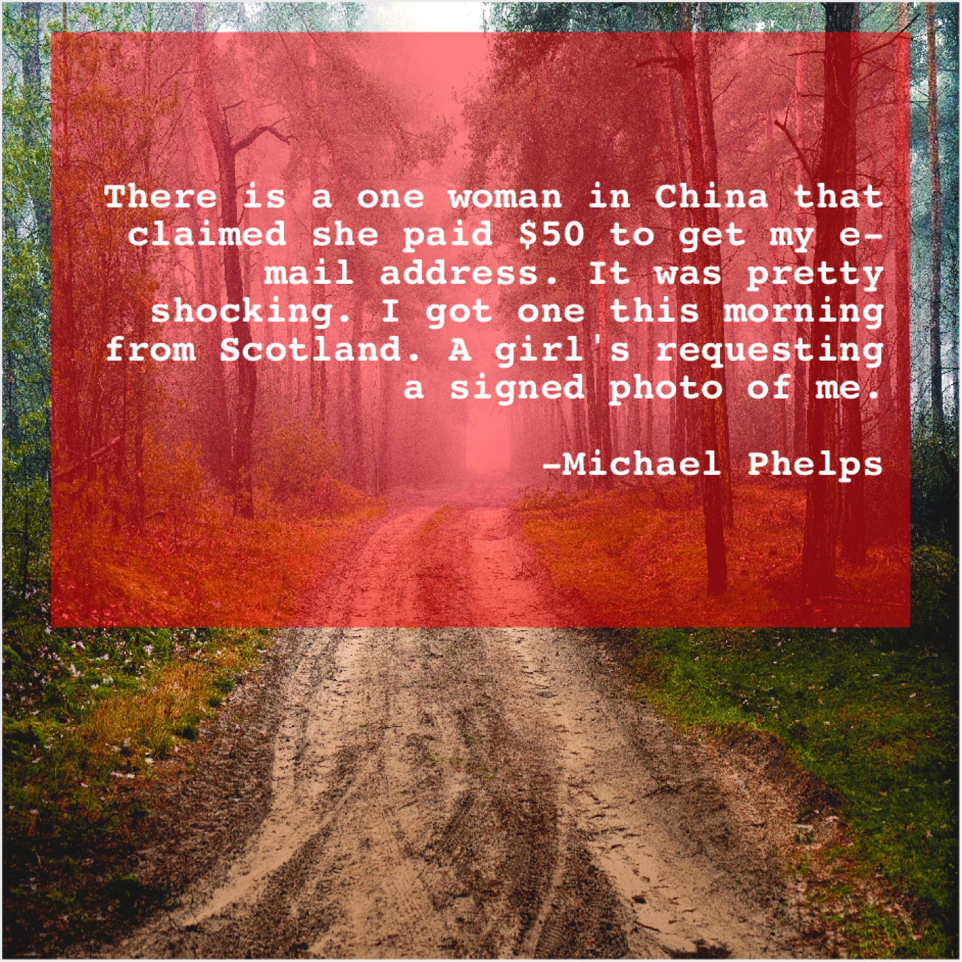 Michael Phelps Michael Phelps – There is a one woman… August 1, 2019 admin “There is a one woman in China that claimed she paid $50 to get my e-mail address. It was pretty shocking. I got one this morning from Scotland. A girl’s requesting a signed photo of me.”-Michael Phelps