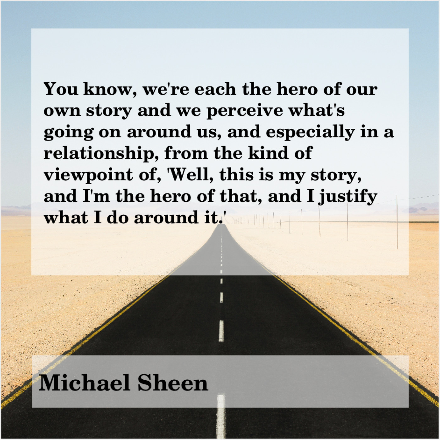 “You know, we’re each the hero of our own story and we perceive what’s going on around us, and especially in a relationship, from the kind of viewpoint of, ‘Well, this is my story, and I’m the hero of that, and I justify what I do around it.'”