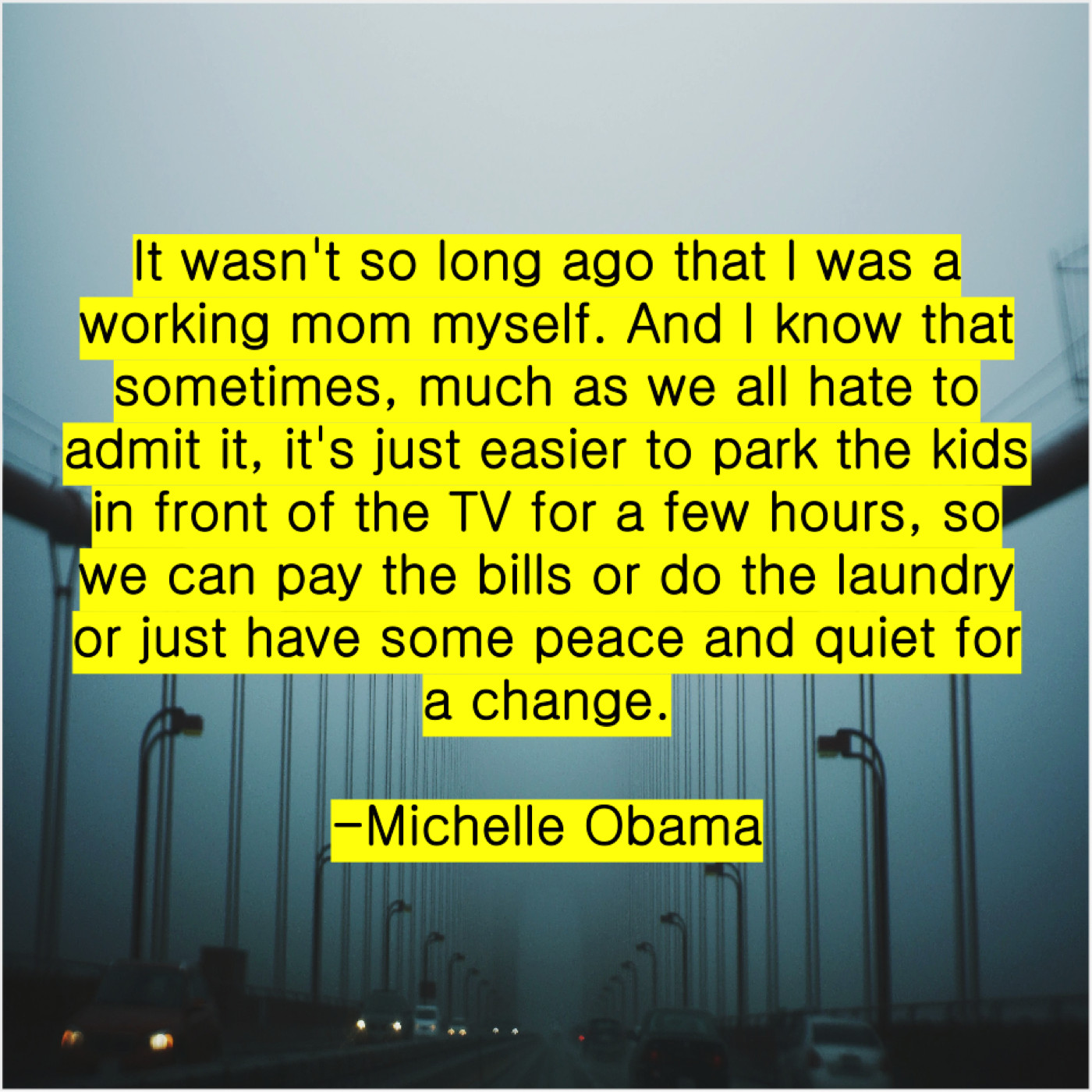 “It wasn’t so long ago that I was a working mom myself. And I know that sometimes, much as we all hate to admit it, it’s just easier to park the kids in front of the TV for a few hours, so we can pay the bills or do the laundry or just have some peace and quiet for a change.”