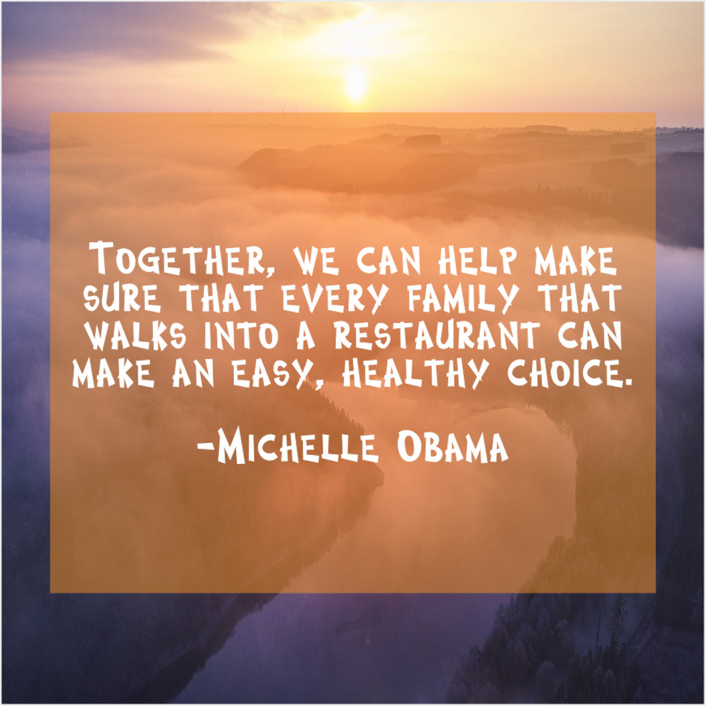 Michelle Obama Michelle Obama – Together, we can help make… September 4, 2019 admin “Together, we can help make sure that every family that walks into a restaurant can make an easy, healthy choice.”-Michelle Obama