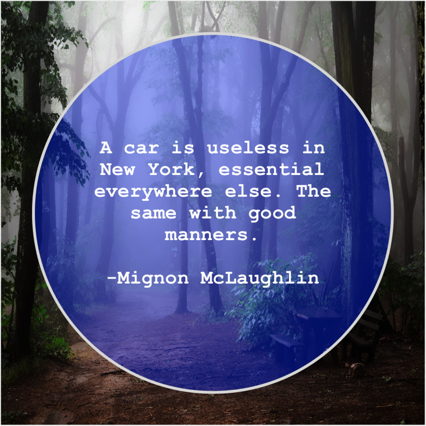 Mignon McLaughlin Mignon McLaughlin – A car is useless in… May 13, 2019 admin “A car is useless in New York, essential everywhere else. The same with good manners.”-Mignon McLaughlin
