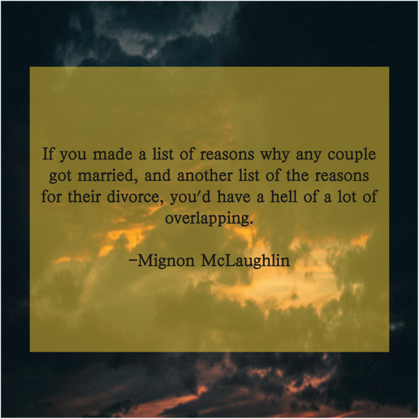 Mignon McLaughlin Mignon McLaughlin – If you made a list… June 30, 2019 admin “If you made a list of reasons why any couple got married, and another list of the reasons for their divorce, you’d have a hell of a lot of overlapping.”-Mignon McLaughlin