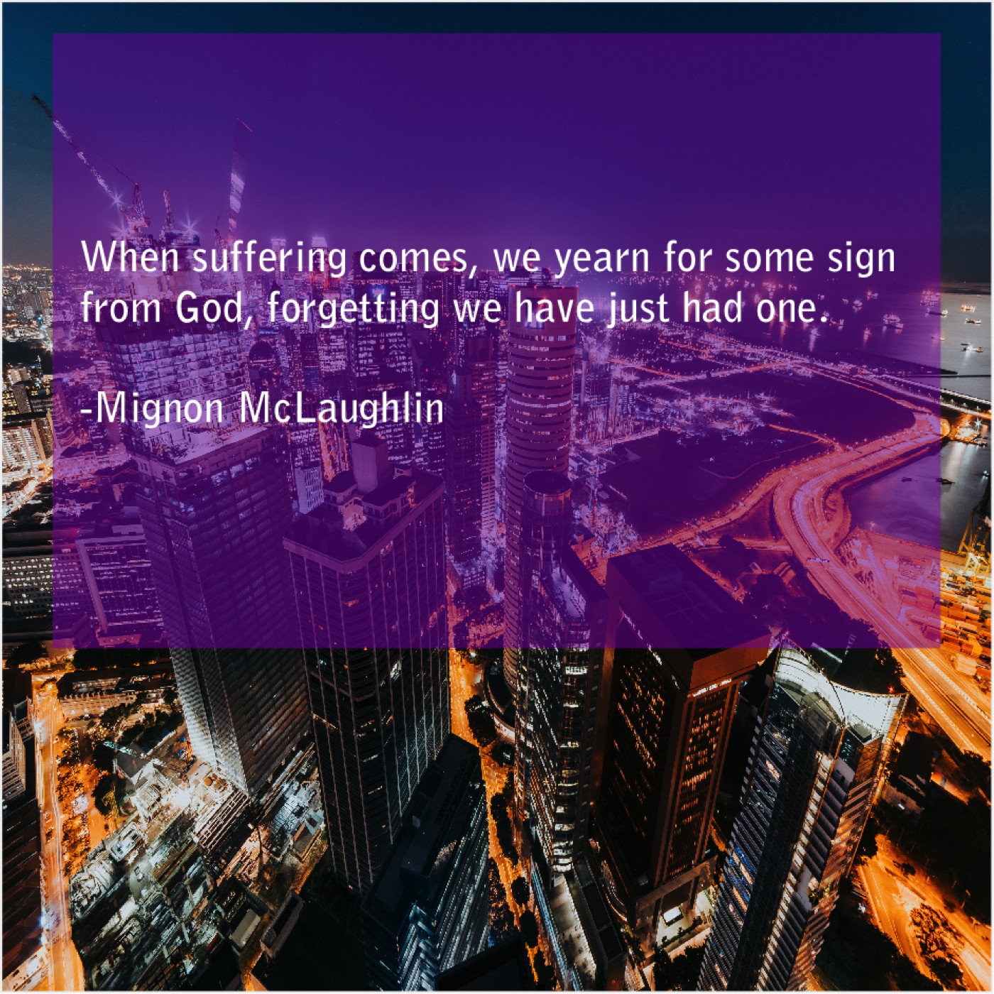 Mignon McLaughlin Mignon McLaughlin – When suffering comes, we yearn… October 16, 2019 admin “When suffering comes, we yearn for some sign from God, forgetting we have just had one.”-Mignon McLaughlin