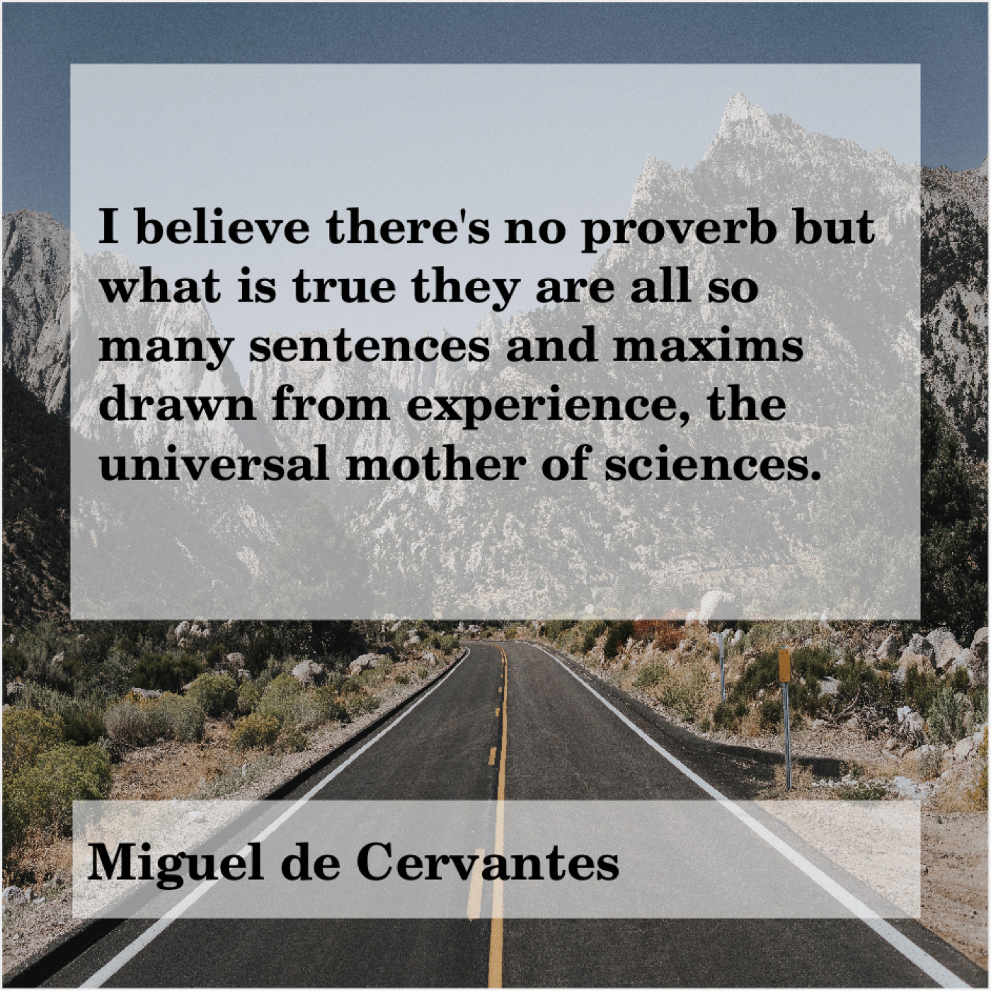 Miguel de Cervantes Miguel de Cervantes – I believe there’s no proverb… September 12, 2019 admin “I believe there’s no proverb but what is true they are all so many sentences and maxims drawn from experience, the universal mother of sciences.”-Miguel de Cervantes