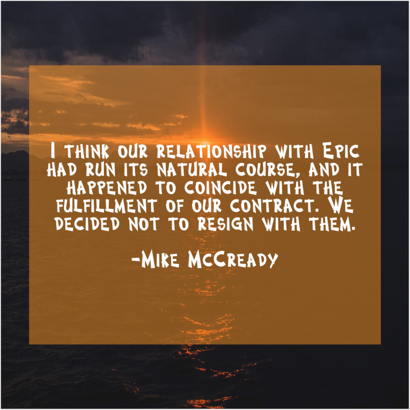 Mike McCready Mike McCready – I think our relationship with… August 28, 2019 admin “I think our relationship with Epic had run its natural course, and it happened to coincide with the fulfillment of our contract. We decided not to resign with them.”-Mike McCready
