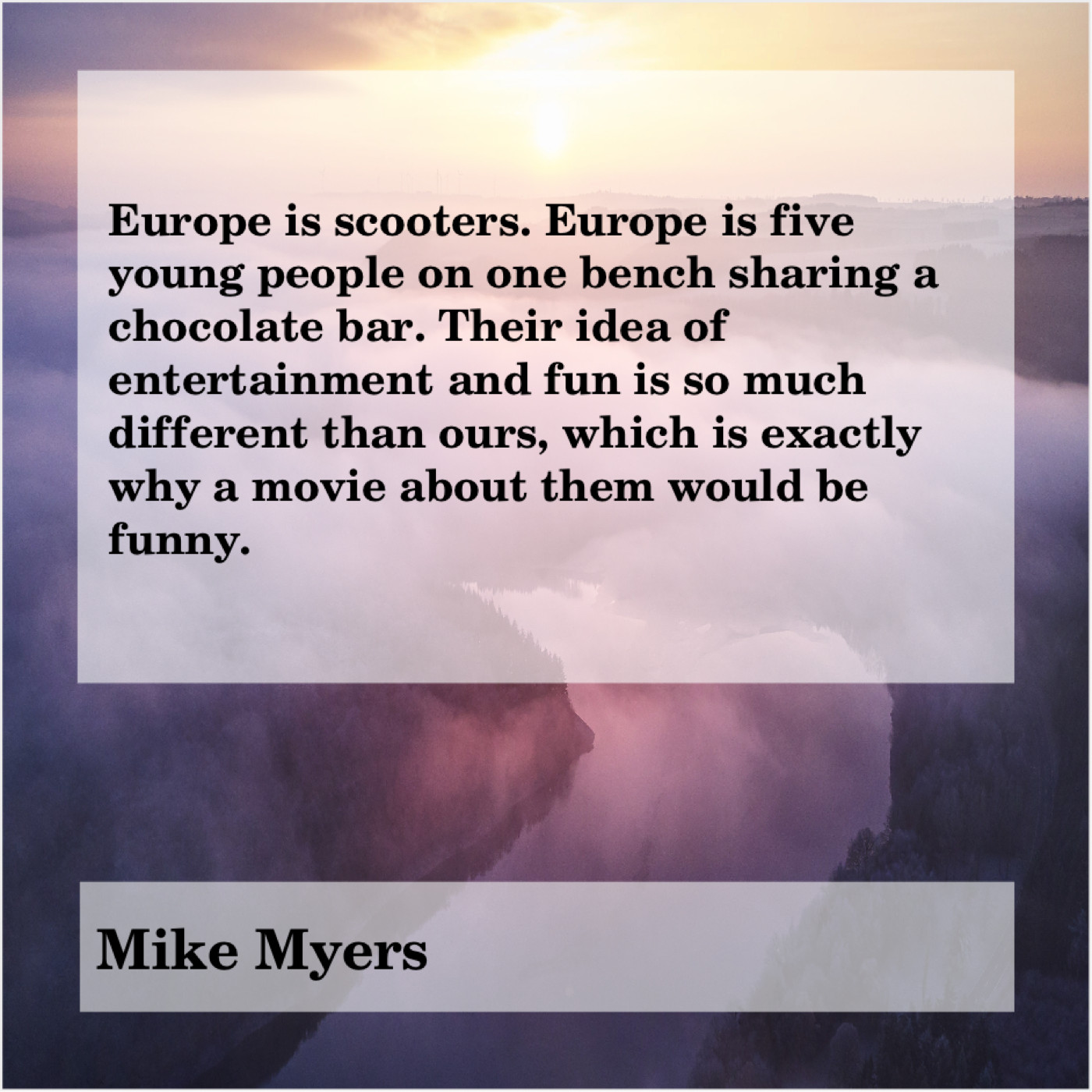 Mike Myers Mike Myers – Europe is scooters. Europe is… June 27, 2019 admin “Europe is scooters. Europe is five young people on one bench sharing a chocolate bar. Their idea of entertainment and fun is so much different than ours, which is exactly why a movie about them would be funny.”-Mike Myers