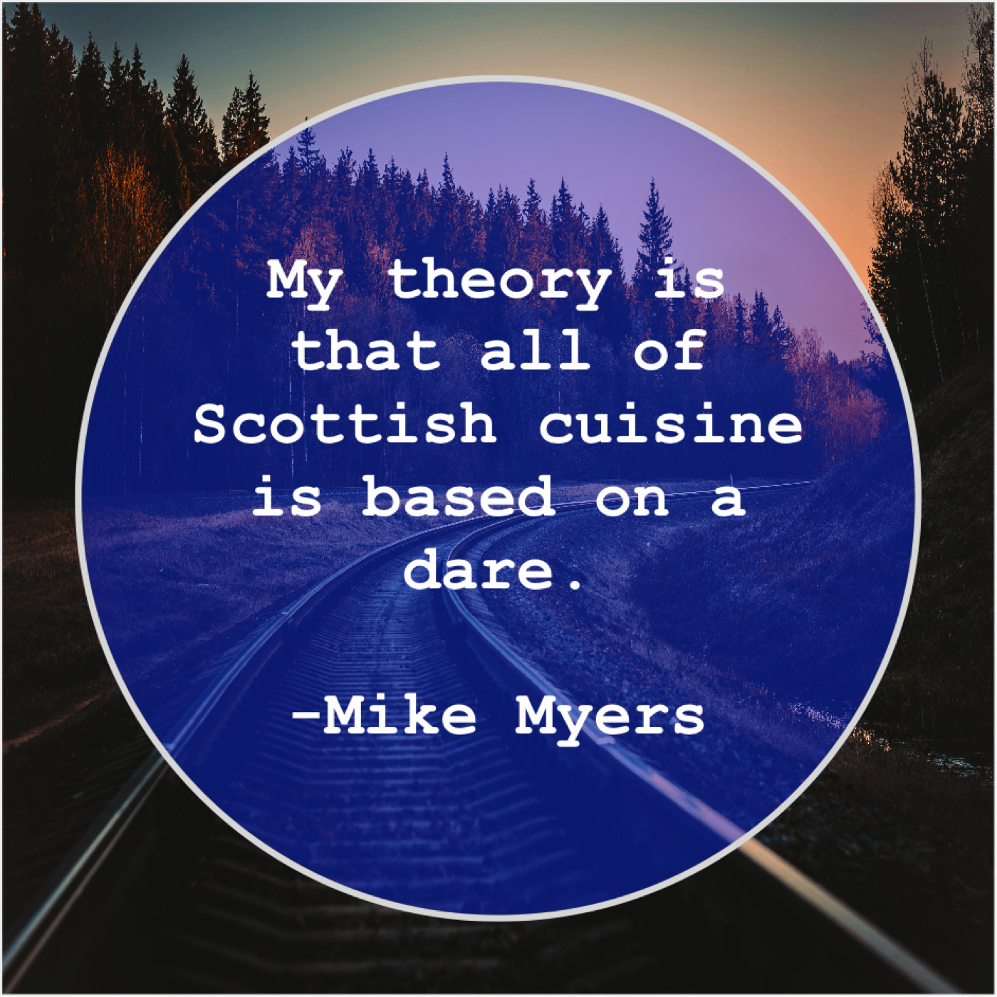 Mike Myers Mike Myers – My theory is that all… August 1, 2019 admin “My theory is that all of Scottish cuisine is based on a dare.”-Mike Myers