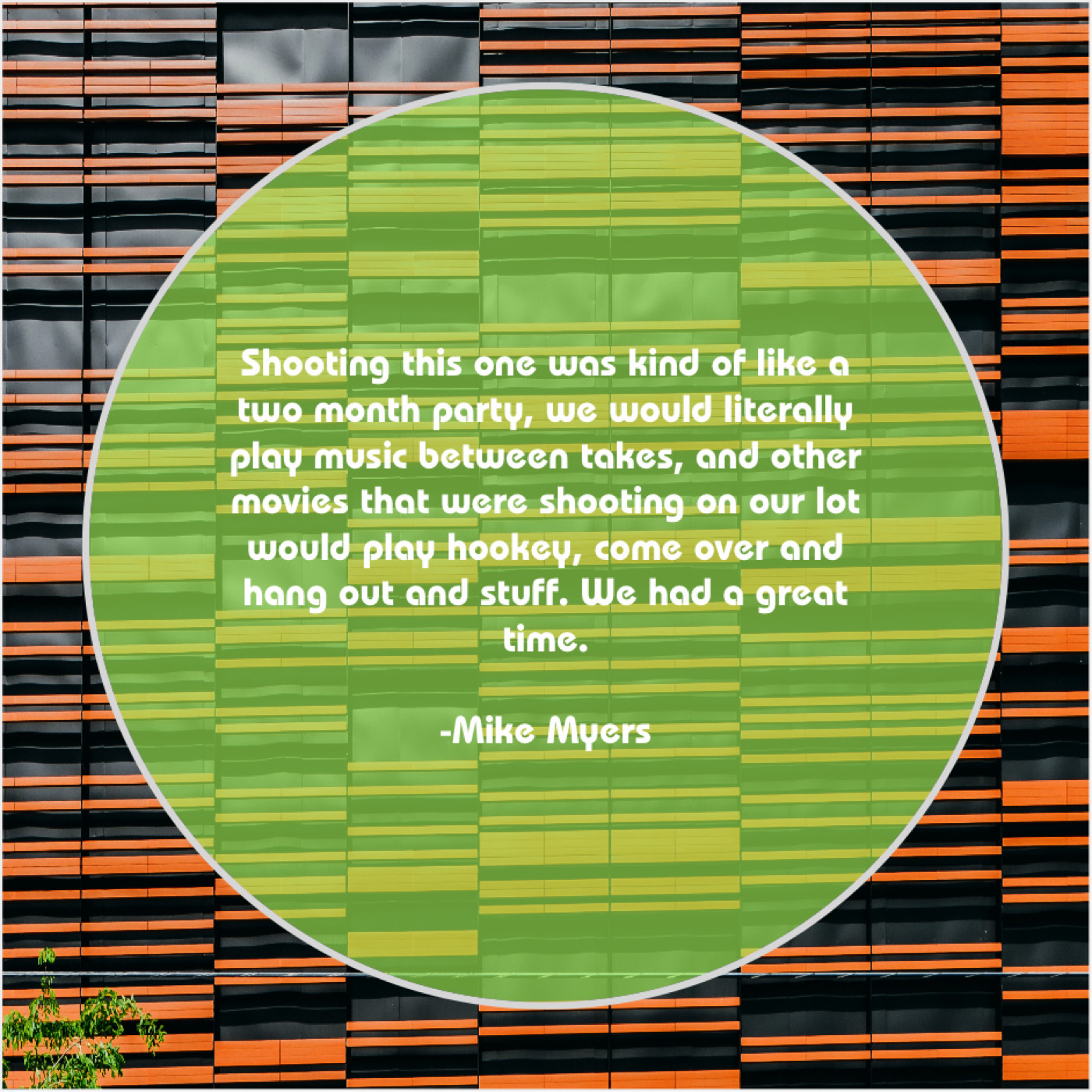 Mike Myers Mike Myers – Shooting this one was kind… April 20, 2019 admin “Shooting this one was kind of like a two month party, we would literally play music between takes, and other movies that were shooting on our lot would play hookey, come over and hang out and stuff. We had a great time.”-Mike Myers