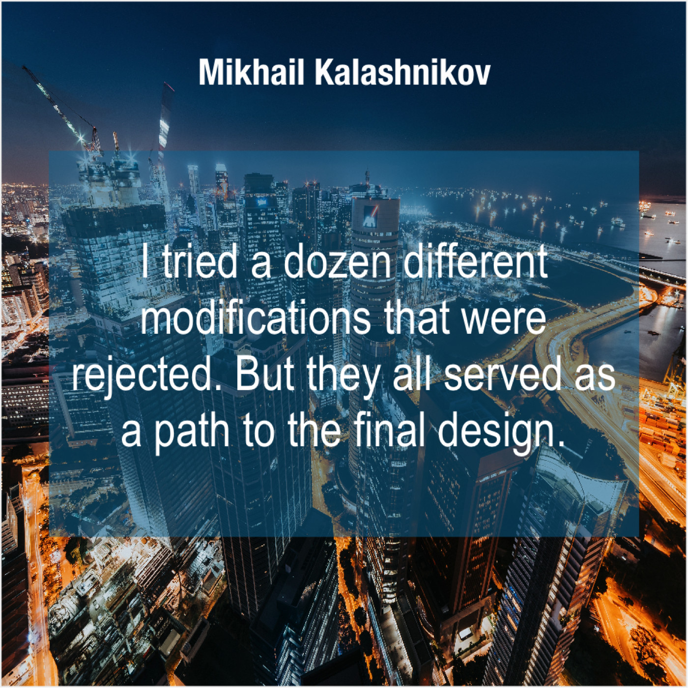 Mikhail Kalashnikov Mikhail Kalashnikov – I tried a dozen different… December 7, 2018 admin “I tried a dozen different modifications that were rejected. But they all served as a path to the final design.”-Mikhail Kalashnikov