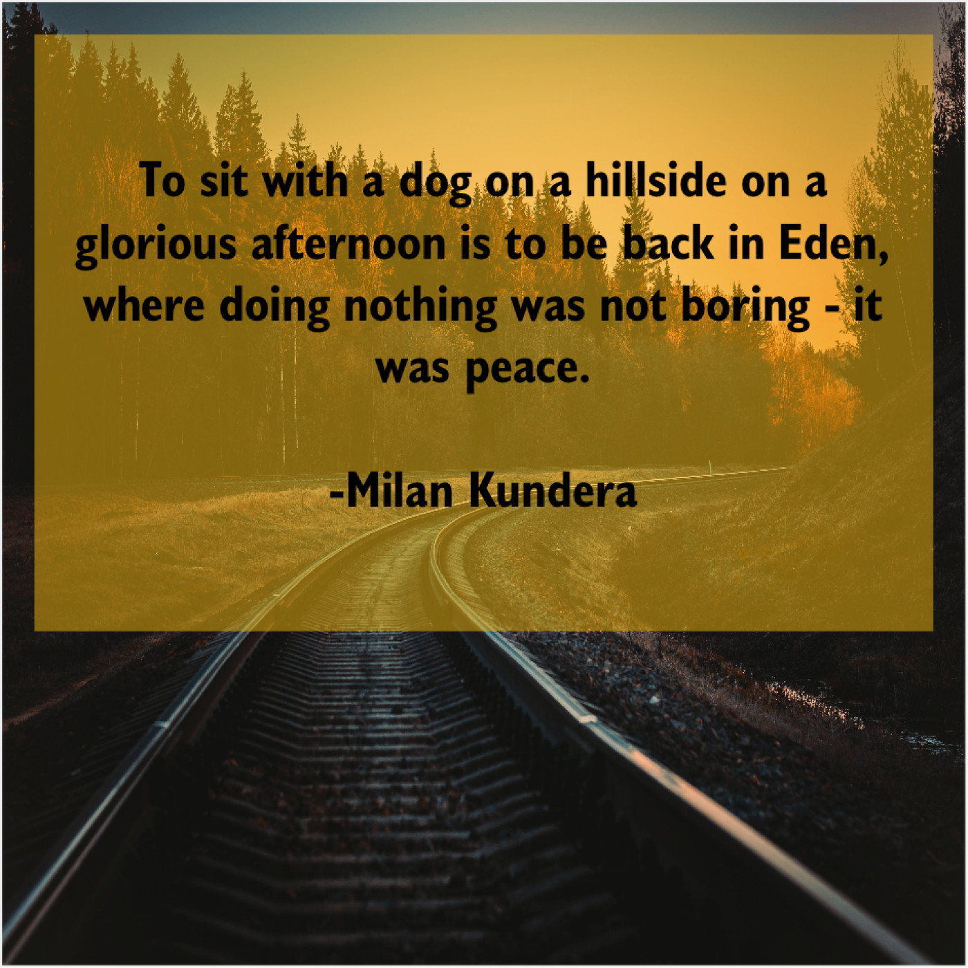 Milan Kundera Milan Kundera – To sit with a dog… May 3, 2019 admin “To sit with a dog on a hillside on a glorious afternoon is to be back in Eden, where doing nothing was not boring – it was peace.”-Milan Kundera
