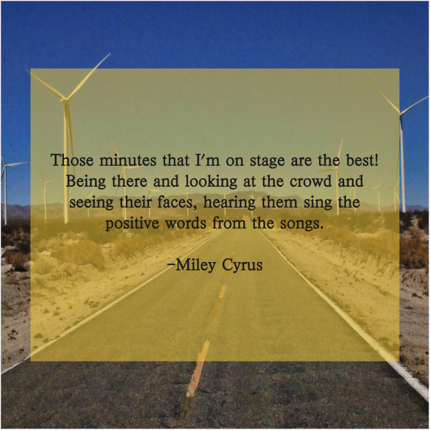 Miley Cyrus Miley Cyrus – Those minutes that I’m on… October 19, 2019 admin “Those minutes that I’m on stage are the best! Being there and looking at the crowd and seeing their faces, hearing them sing the positive words from the songs.”-Miley Cyrus