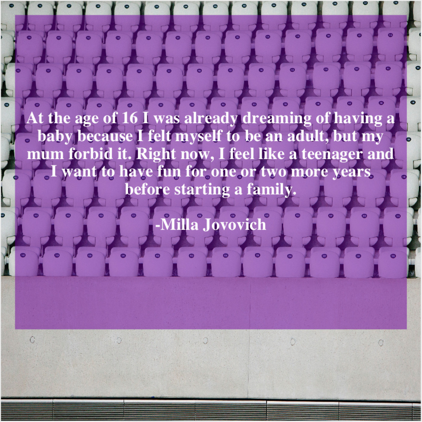 Milla Jovovich Milla Jovovich – At the age of 16… December 23, 2018 admin “At the age of 16 I was already dreaming of having a baby because I felt myself to be an adult, but my mum forbid it. Right now, I feel like a teenager and I want to have fun for one or two more years before starting a family.”-Milla Jovovich