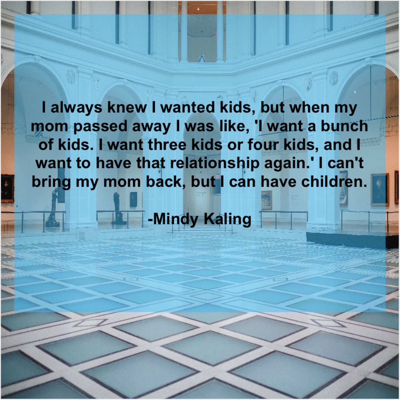 Mindy Kaling Mindy Kaling – I always knew I wanted… May 13, 2019 admin “I always knew I wanted kids, but when my mom passed away I was like, ‘I want a bunch of kids. I want three kids or four kids, and I want to have that relationship again.’ I can’t bring my mom back, but I can have children.”-Mindy Kaling