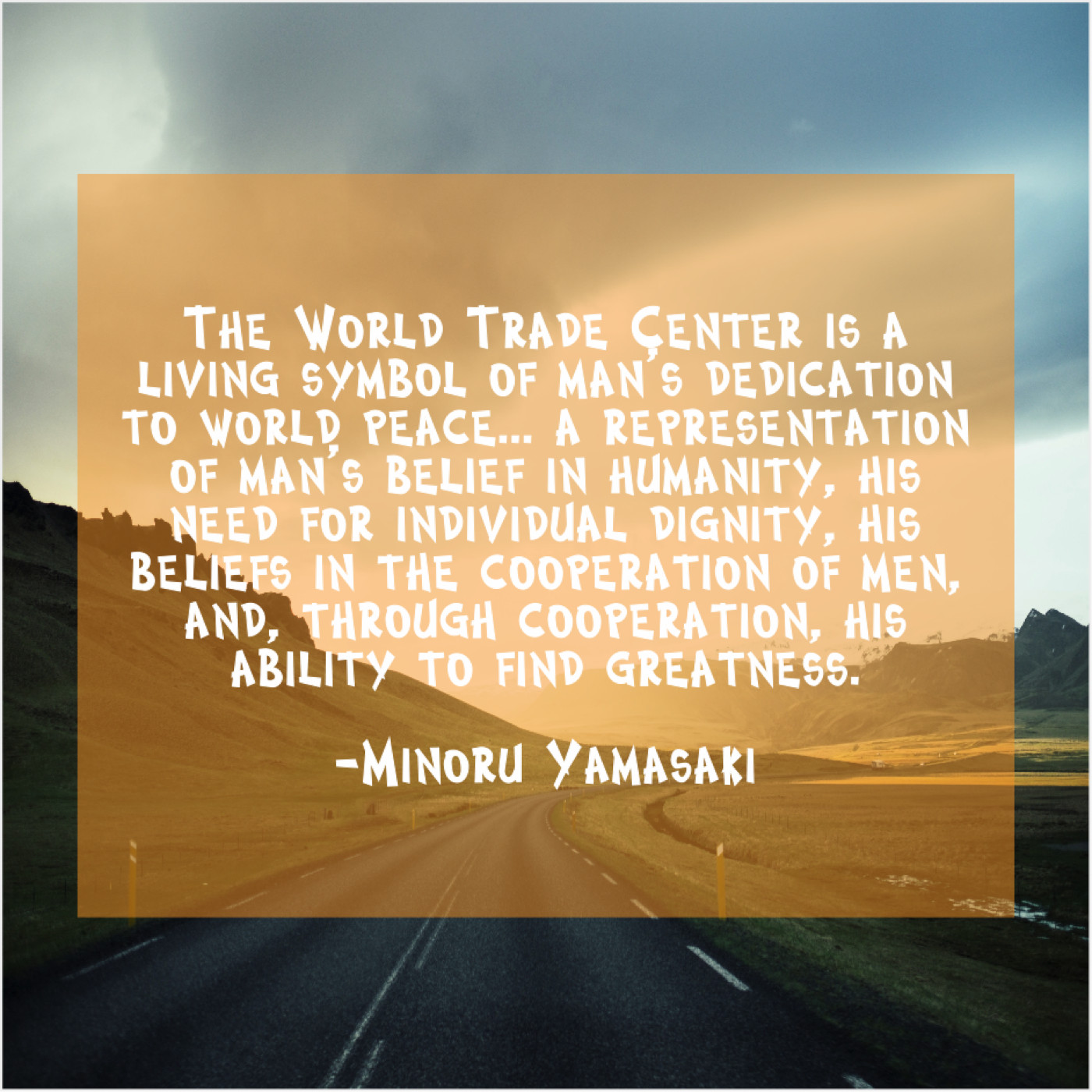 “The World Trade Center is a living symbol of man’s dedication to world peace… a representation of man’s belief in humanity, his need for individual dignity, his beliefs in the cooperation of men, and, through cooperation, his ability to find greatness.”