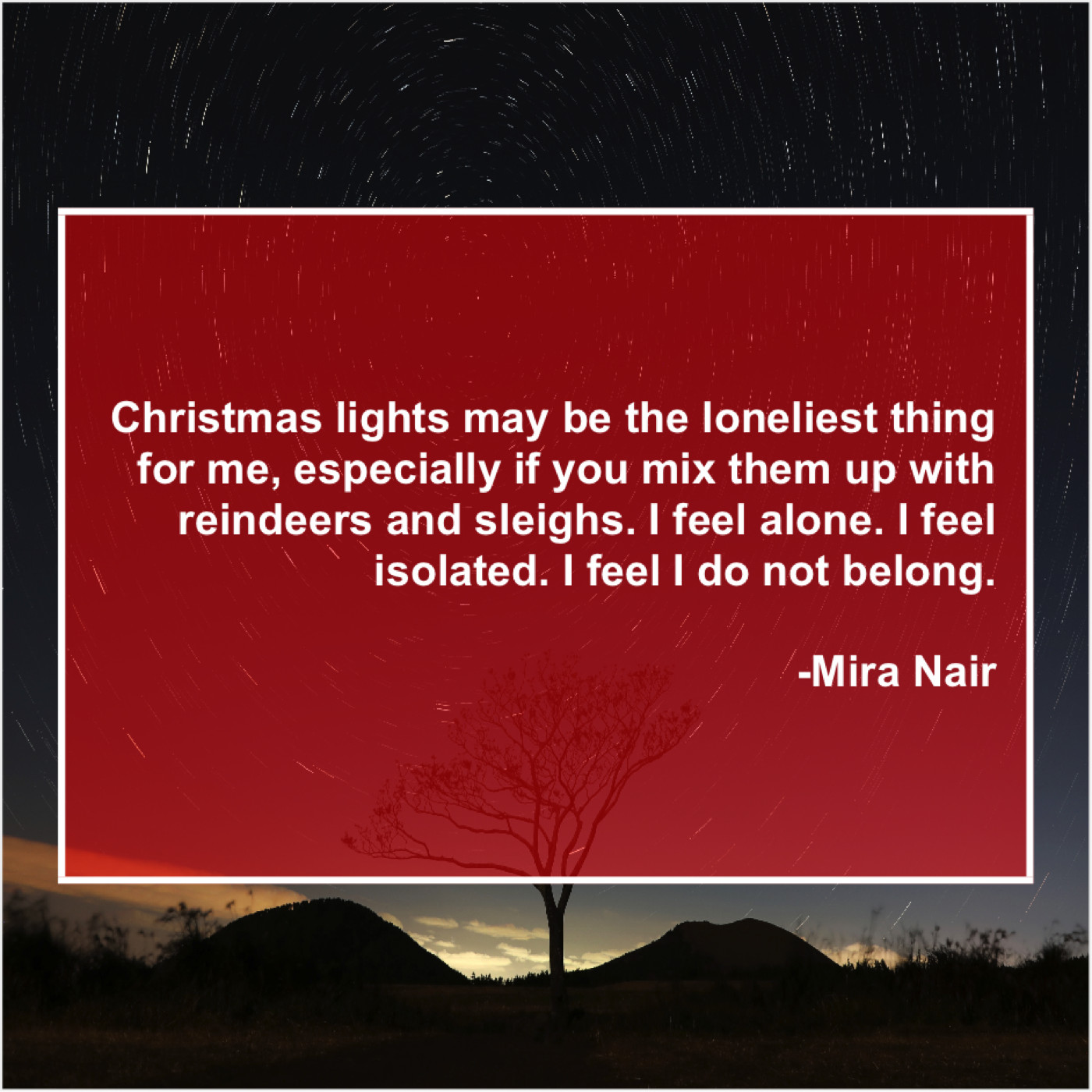 Mira Nair Mira Nair – Christmas lights may be the… January 5, 2019 admin “Christmas lights may be the loneliest thing for me, especially if you mix them up with reindeers and sleighs. I feel alone. I feel isolated. I feel I do not belong.”-Mira Nair