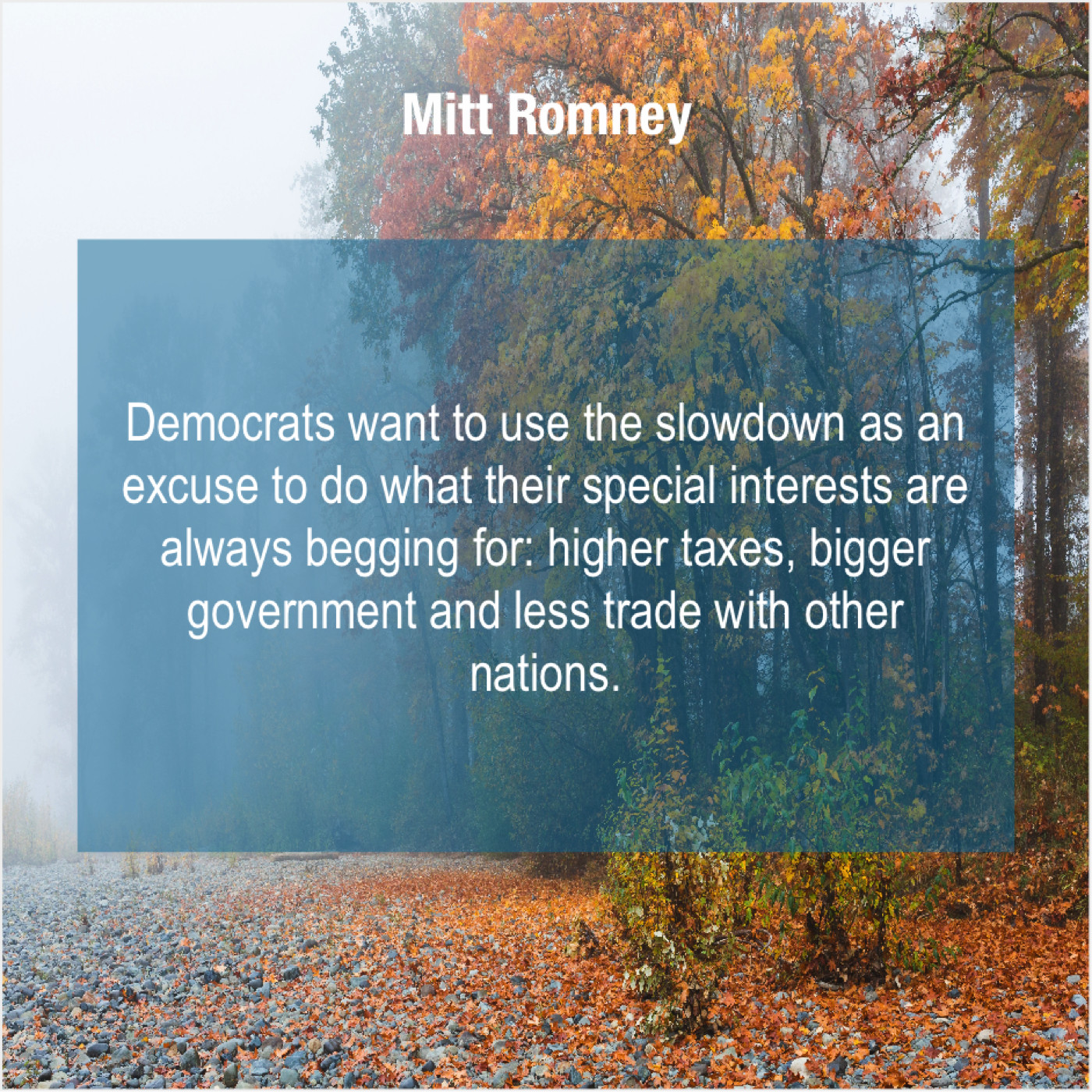 Mitt Romney Mitt Romney – Democrats want to use the… January 17, 2019 admin “Democrats want to use the slowdown as an excuse to do what their special interests are always begging for: higher taxes, bigger government and less trade with other nations.”-Mitt Romney