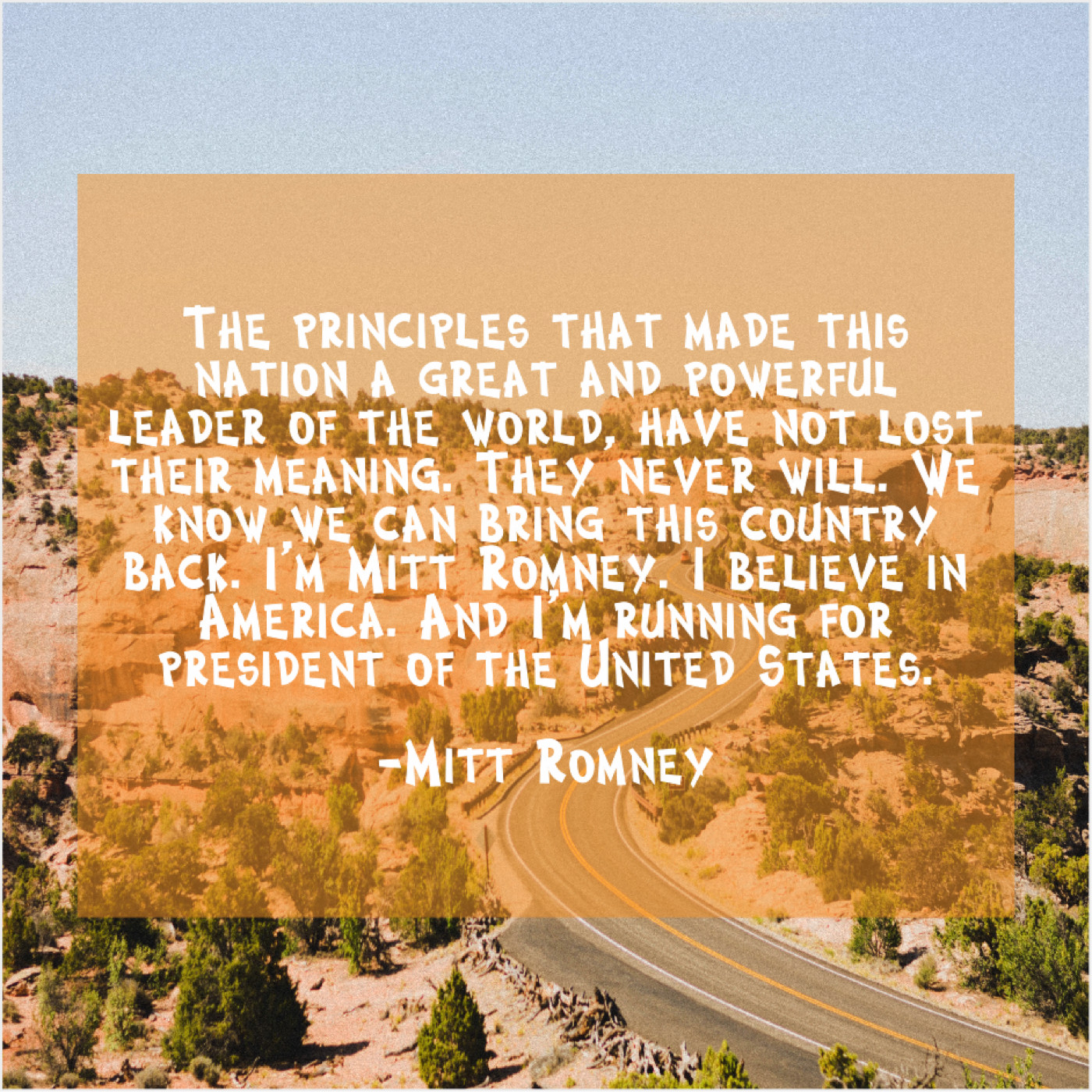 “The principles that made this nation a great and powerful leader of the world, have not lost their meaning. They never will. We know we can bring this country back. I’m Mitt Romney. I believe in America. And I’m running for president of the United States.”