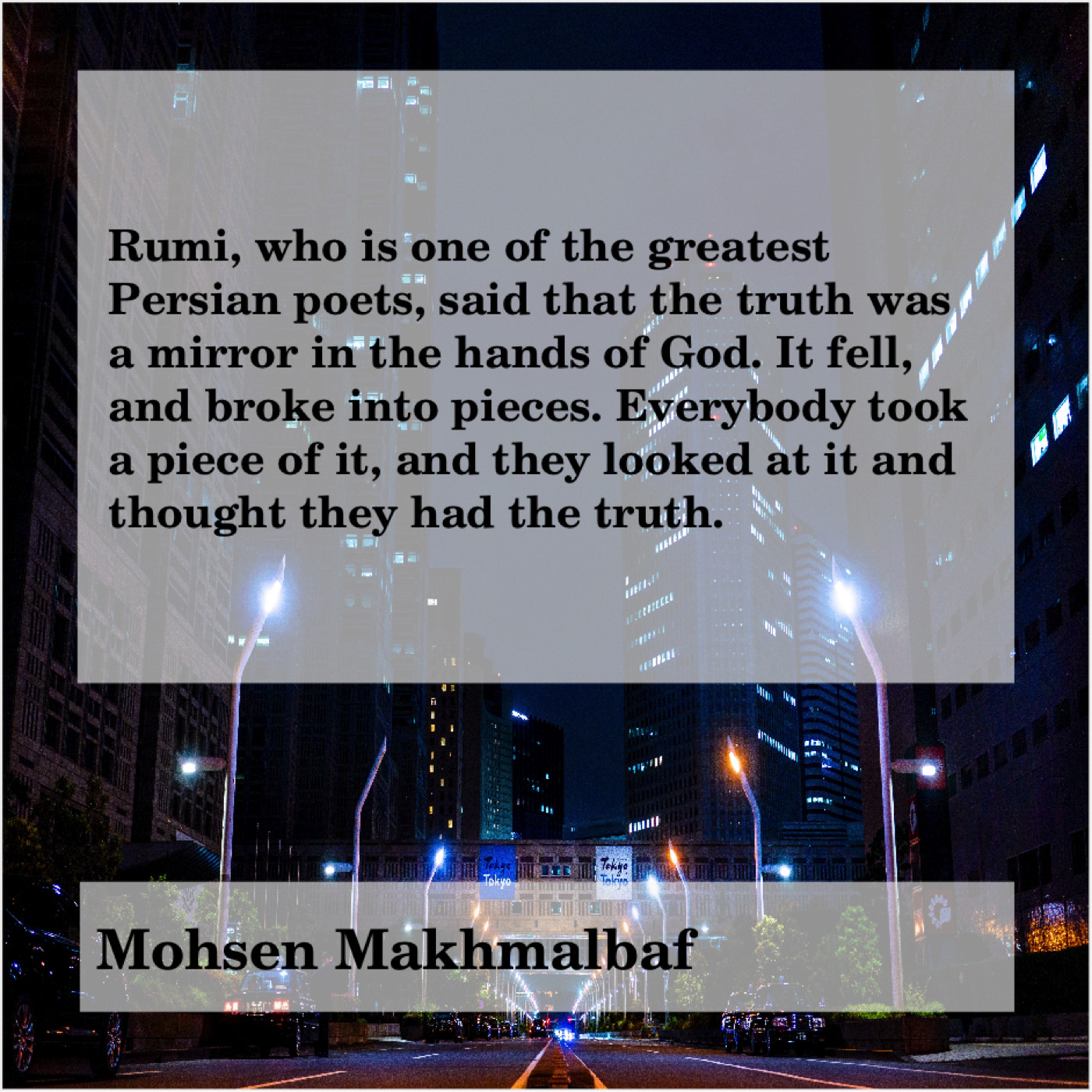 Mohsen Makhmalbaf Mohsen Makhmalbaf – Rumi, who is one of… September 11, 2019 admin “Rumi, who is one of the greatest Persian poets, said that the truth was a mirror in the hands of God. It fell, and broke into pieces. Everybody took a piece of it, and they looked at it and thought they had the truth.”-Mohsen Makhmalbaf