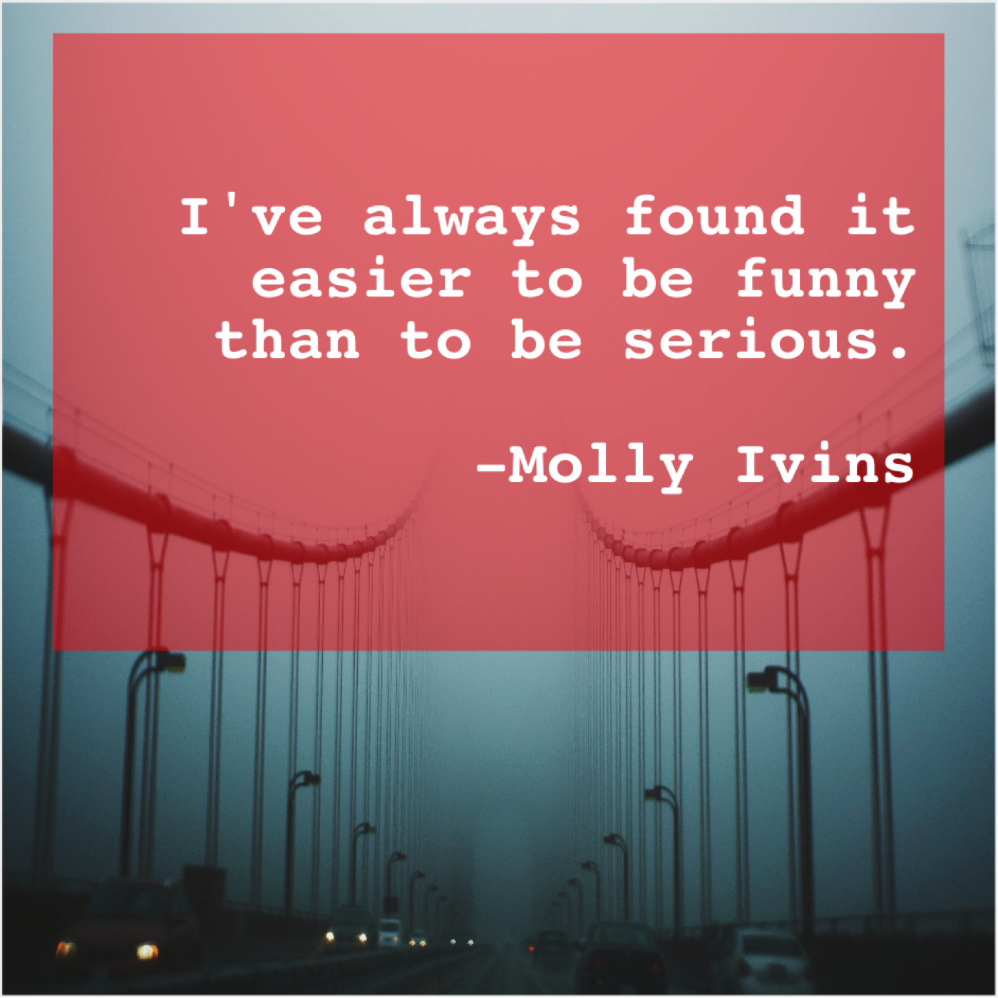 Molly Ivins Molly Ivins – I’ve always found it easier… May 7, 2019 admin “I’ve always found it easier to be funny than to be serious.”-Molly Ivins