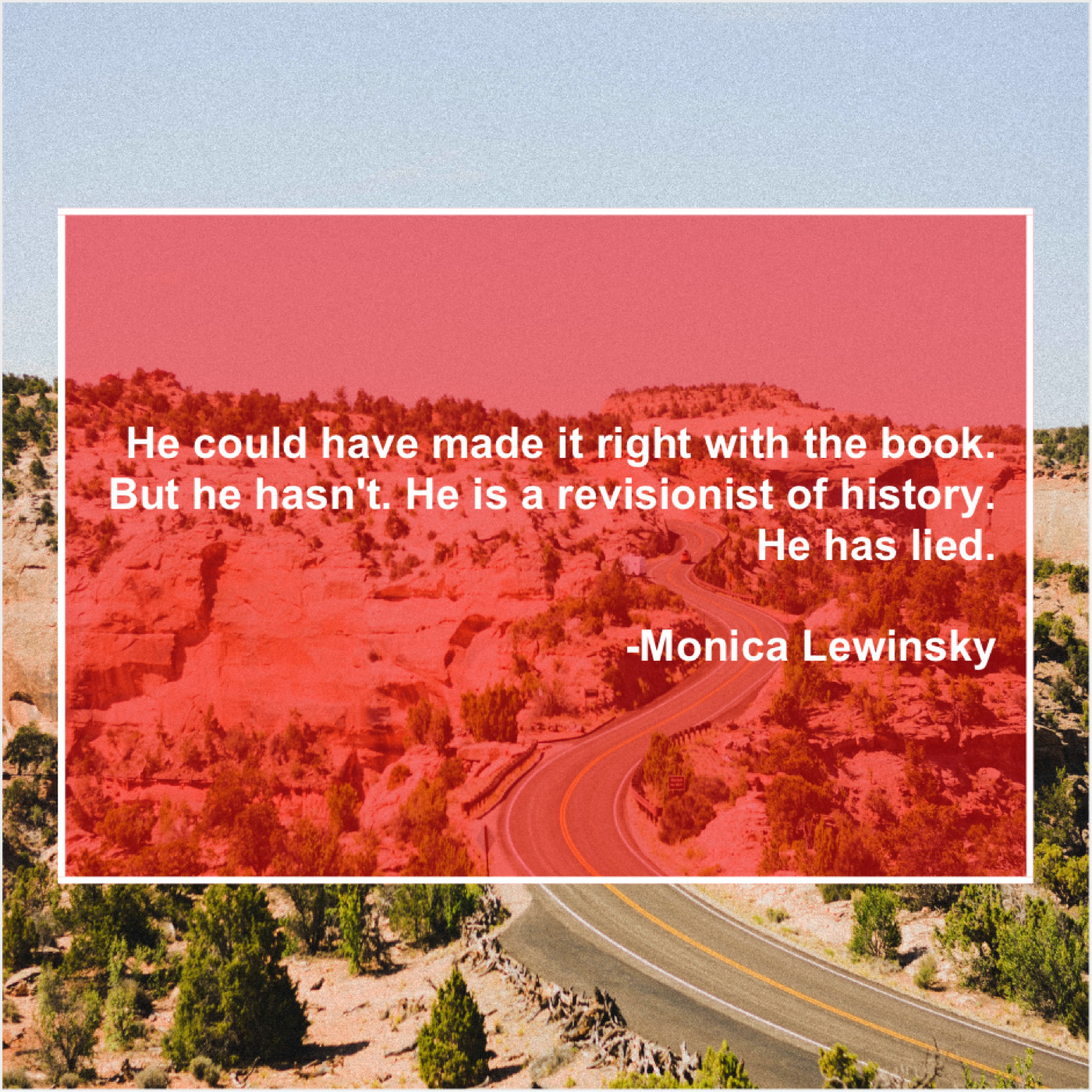 Monica Lewinsky Monica Lewinsky – He could have made it… September 3, 2019 admin “He could have made it right with the book. But he hasn’t. He is a revisionist of history. He has lied.”-Monica Lewinsky