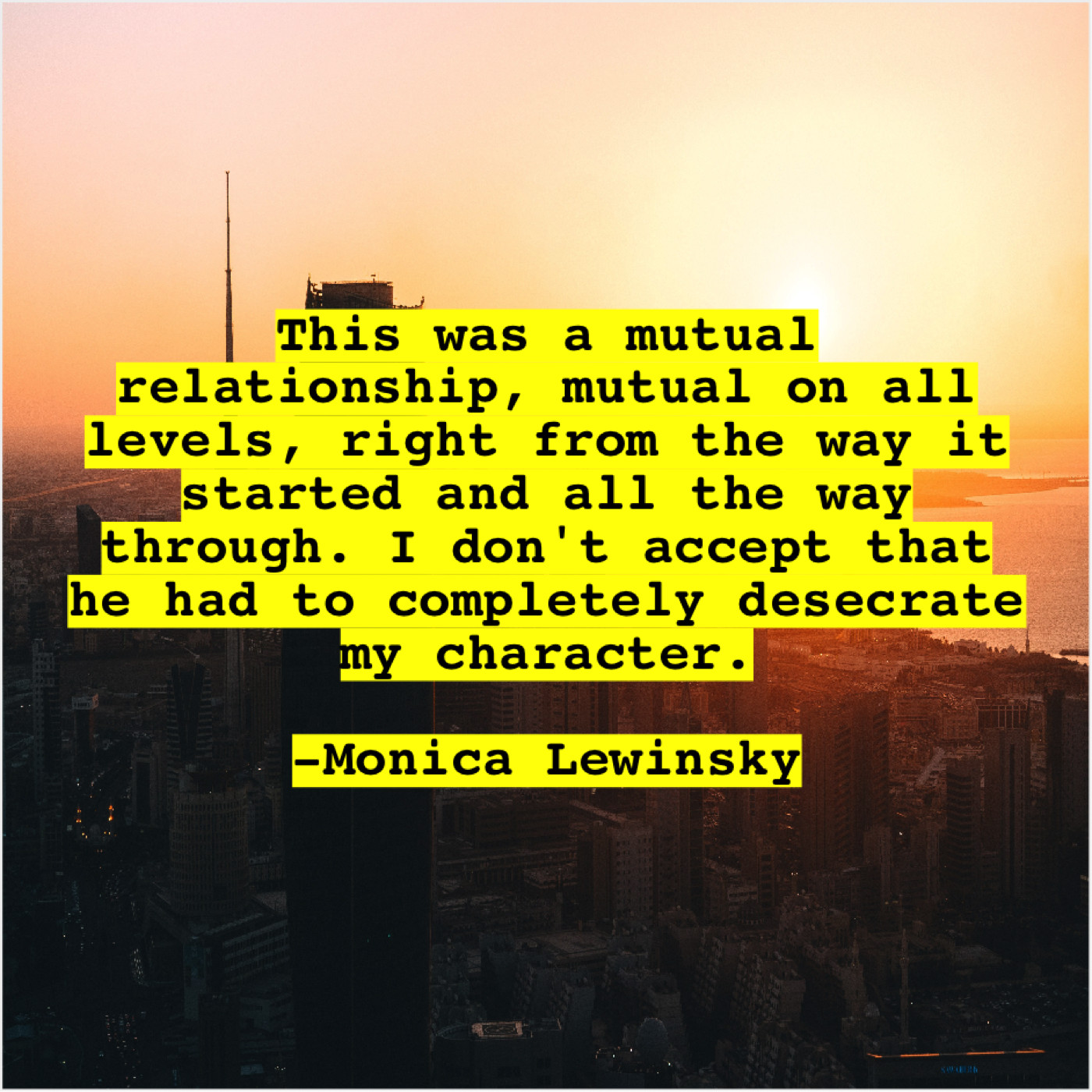 Monica Lewinsky Monica Lewinsky – This was a mutual relationship… August 1, 2019 admin “This was a mutual relationship, mutual on all levels, right from the way it started and all the way through. I don’t accept that he had to completely desecrate my character.”-Monica Lewinsky