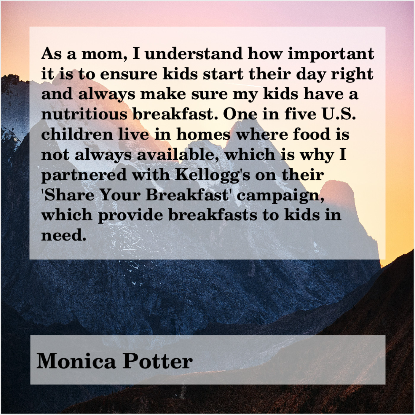 “As a mom, I understand how important it is to ensure kids start their day right and always make sure my kids have a nutritious breakfast. One in five U.S. children live in homes where food is not always available, which is why I partnered with Kellogg’s on their ‘Share Your Breakfast’ campaign, which provide breakfasts to kids in need.”