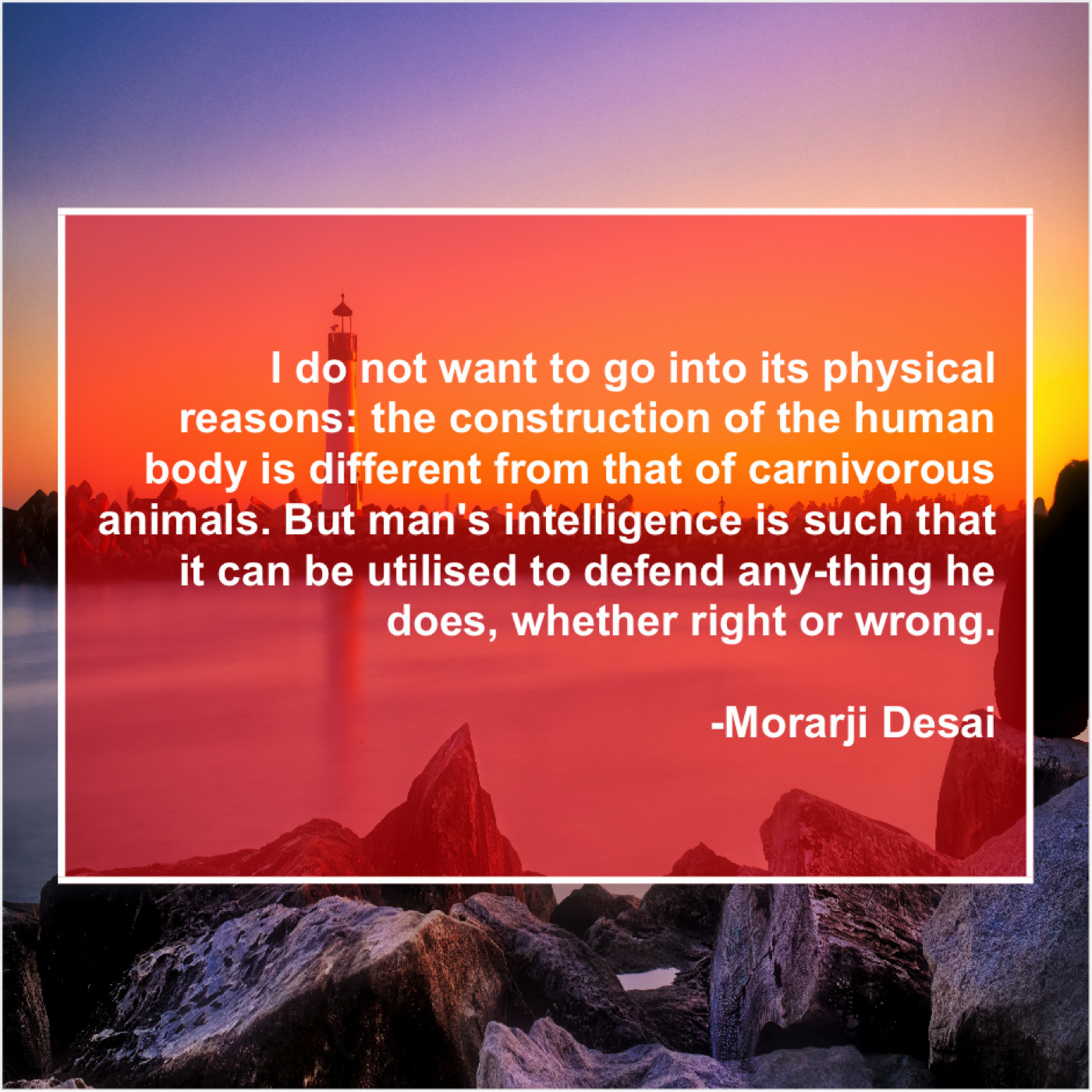 “I do not want to go into its physical reasons: the construction of the human body is different from that of carnivorous animals. But man’s intelligence is such that it can be utilised to defend any-thing he does, whether right or wrong.”